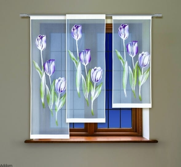 Kolorowe panele w kwiaty, fioletowe tulipany o zielonych łodyżkach, żakardowe, z tunelem. Wzór wykonany jest żakardem, potem malowany ręcznie wodoodpornymi farbami. Firanki te pakowane są pojedynczo, można zakupić dowolną ilość pojedynczych sztuk spośród wysokości 120 - 140 - 160 centymetrów, a szerokość każdego zawsze wynosi 50 centymetrów. Firanek panelowych nie marszczy się, można je powiesić na karniszu z jedną rurką, ale wyjątkowo ciekawie wyglądają kombinacje z paneli wieszanych na dwu rzędowym karniszu, tworzy się wtedy trójwymiarową kompozycję okienną. Firanki powieszone tuż przy szybie stroną malowaną do zewnątrz są kolorowe z obu stron, natomiast wieszając je kolorem do wewnątrz, od zewnątrz będzie widoczny taki panel jako biały, a kolorowy jedynie w środku pomieszczenia.