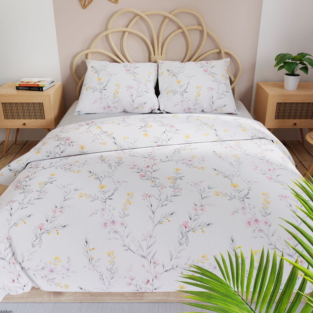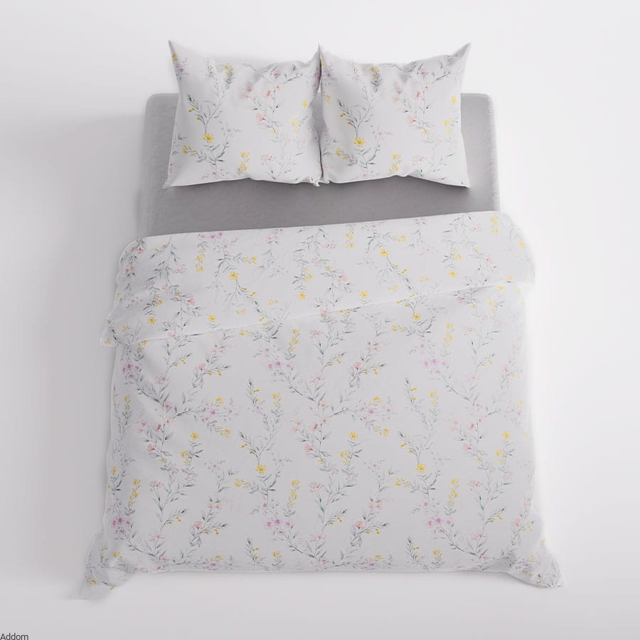 Komplet pościeli w drobne kwiatuszki o zdecydowanych kolorach, na białym albo szarym tle. Delikatna i subtelna, do której można dokupić jaśki w dziale poszewek.