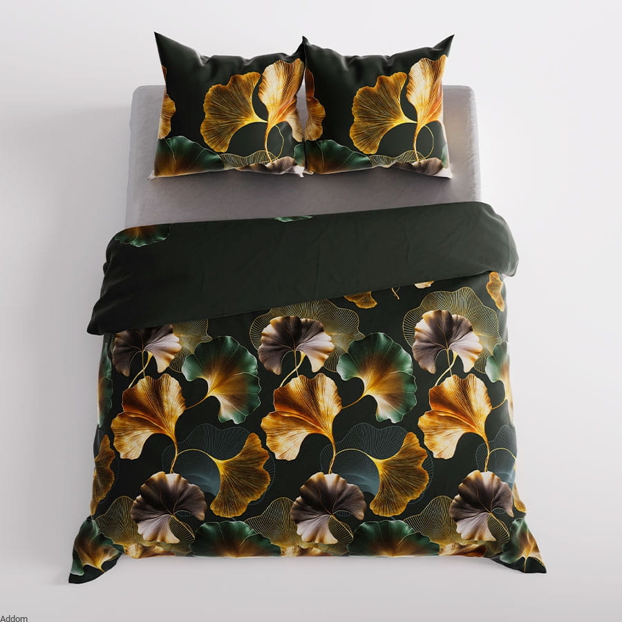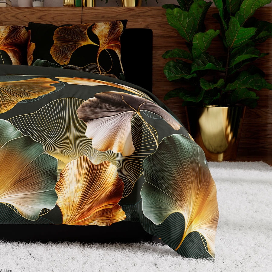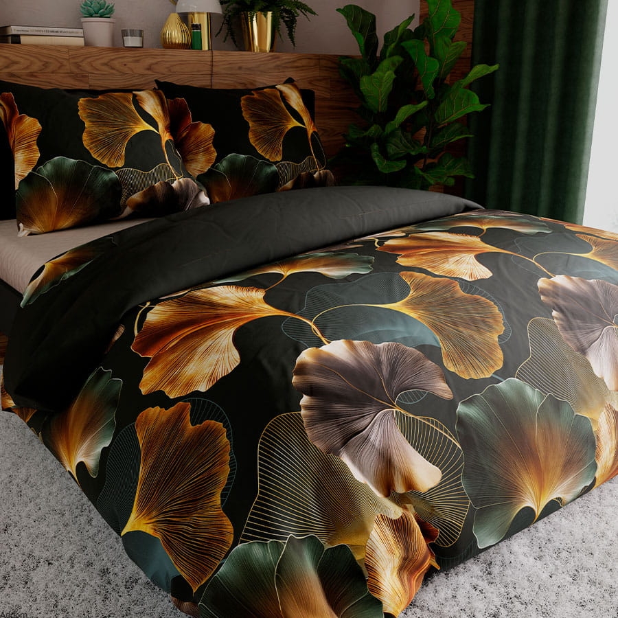 Przenieś swoją sypialnię na wyższy poziom elegancji dzięki kompletowi w czarno - złotej tonacji. Dzięki pościeli satynowej, która zachwyca swoim wyrafinowanym wyglądem i jedwabistą gładkością sen stanie się istną przyjemnością. Lśniący, złoty odcień liści ginko na ciemnej tkaninie dodaje wnętrzu luksusowego charakteru i tworzy atmosferę pełną ciepła oraz prestiżu. Pościel doskonale komponuje się z różnorodnymi stylami aranżacyjnymi – od klasycznego po nowoczesny – nadając łóżku niepowtarzalny wygląd.