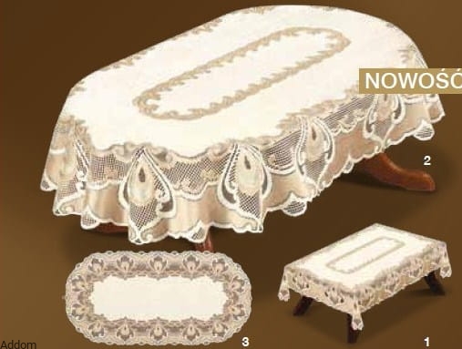 Ciemno kremowe obrusy żakardowe, owalne, w złote, stylowe wzory. Wzory są bardzo gęste, ale towarzyszy im piękny ażur z grubej, złotej nici, w formie siatki. Także tło, które leży na blacie, jest grube i zwięzłe, dobrze chroni blat i przed zarysowaniami, i przed wysoką temperaturą. Obrus jest stylowy, bardzo dostojny, to ten typ żakardu, który będzie odpowiedni do klimatycznych pomieszczeń. Obrus jest owalny, do niego można kupić też owalne bieżniki, ale są też wersje o wykończeniu na blaty prostokątne.