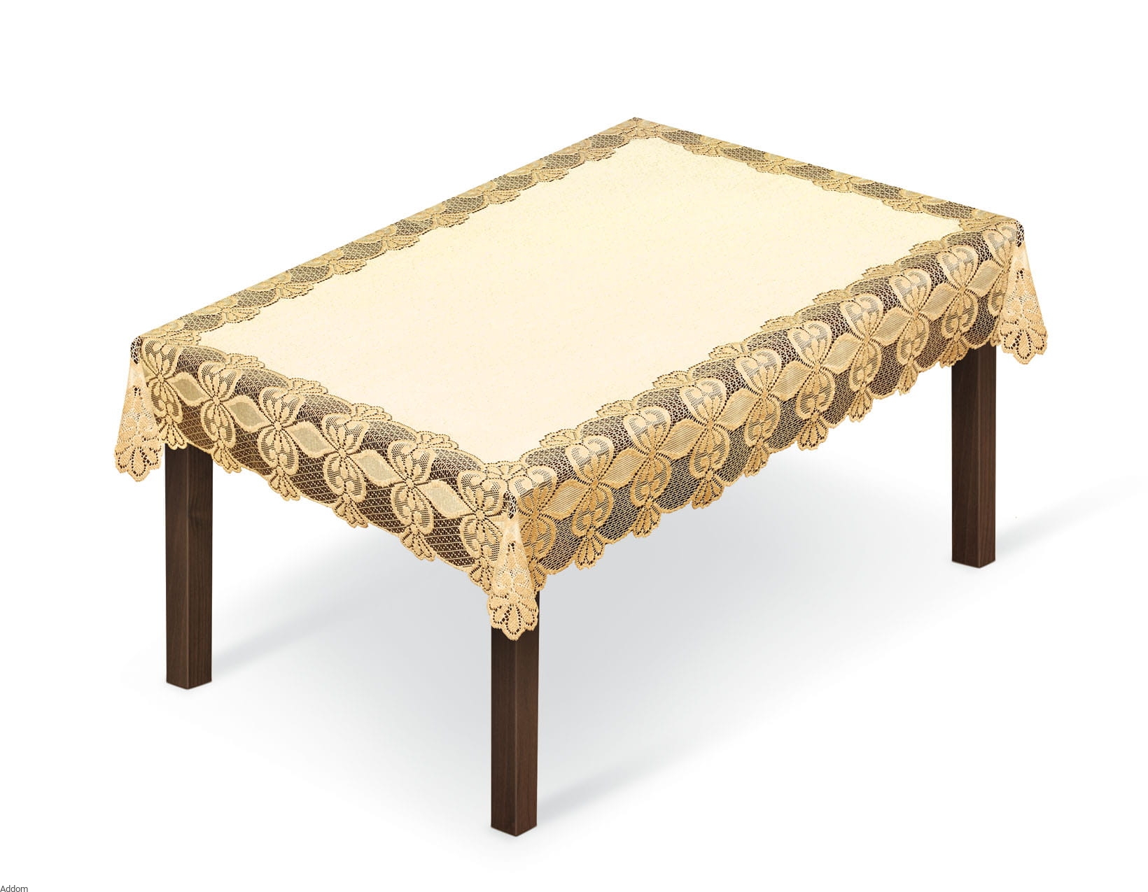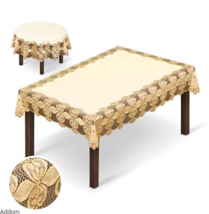Kremowy obrus żakardowy w duże, złote, stylowe wzory. Wzory są dobrze wyróżniające się, gęste, co ciekawie kontrastuje z siatką z grubego ażuru, z grubej przędzy. Dzianina, która spocznie na blacie, jest gruba i zwięzła, będzie spełniać idealnie funkcje ochronne. Siatka wyglądająca jak gipiura otacza nie tylko cały obrus poniżej krawędzi blatu, ale także duże, stylowe wzory.