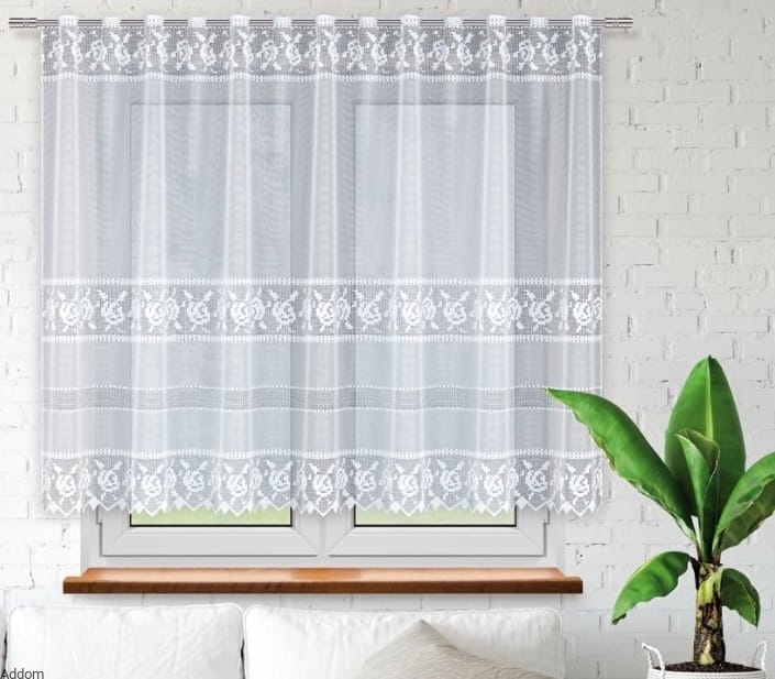 Firanki gotowe, które górą posiadają otwory, tak zwane przelotki, do przeciągania przez nie karnisza. Otwory te mają średnicę 2 centymetry. Firanki są krótkie, o wysokości 100, 135 lub 160 cm, żakard jest produkcji kaliskiej, kolekcja Ażur Plus. Zdobnictwo tych firaneczek to różyczki stylizowane na haft angielski w towarzystwie kraciastych pasków poziomych. Dół wykończony w trójkątne elementy. Całość daje wrażenie firan rustykalnych, swojskich, pożądanych w przytulnej kuchni.