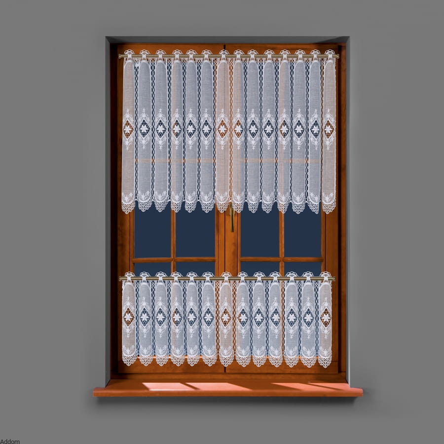 Firany z batystu haftowanego i gipiury, z gipiurowymi otworami na drążek górą. Firany te nie wymagają obszywania gdyż odcięcie oznacza gotowość do zawieszenia. Środek każdego panelu zawierają wstawkę dekoracyjną z gipiury, poza wysokością 30 cm, które tej wstawki nie mają, mają tylko wykończenie z gipiury. Na uwagę szczególnie zasługuje dolna część paneli, zawierająca najwięcej gipiury.