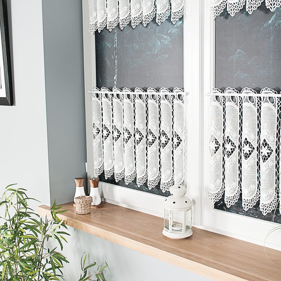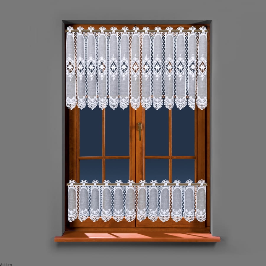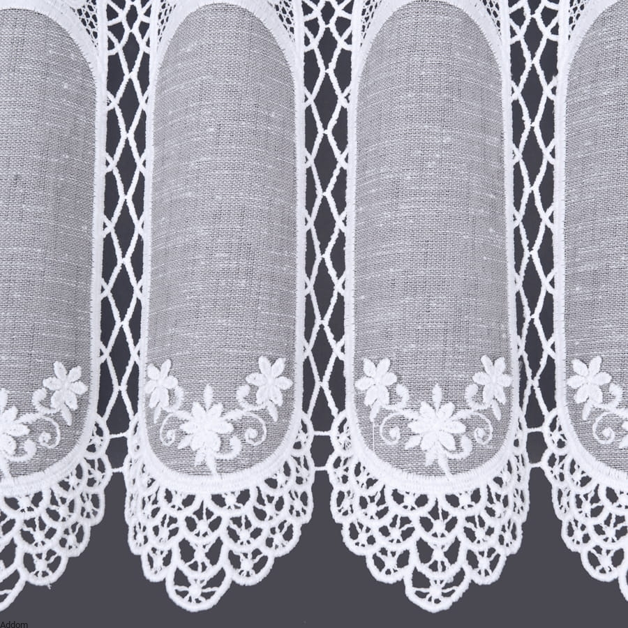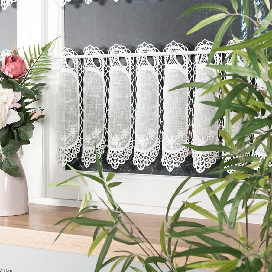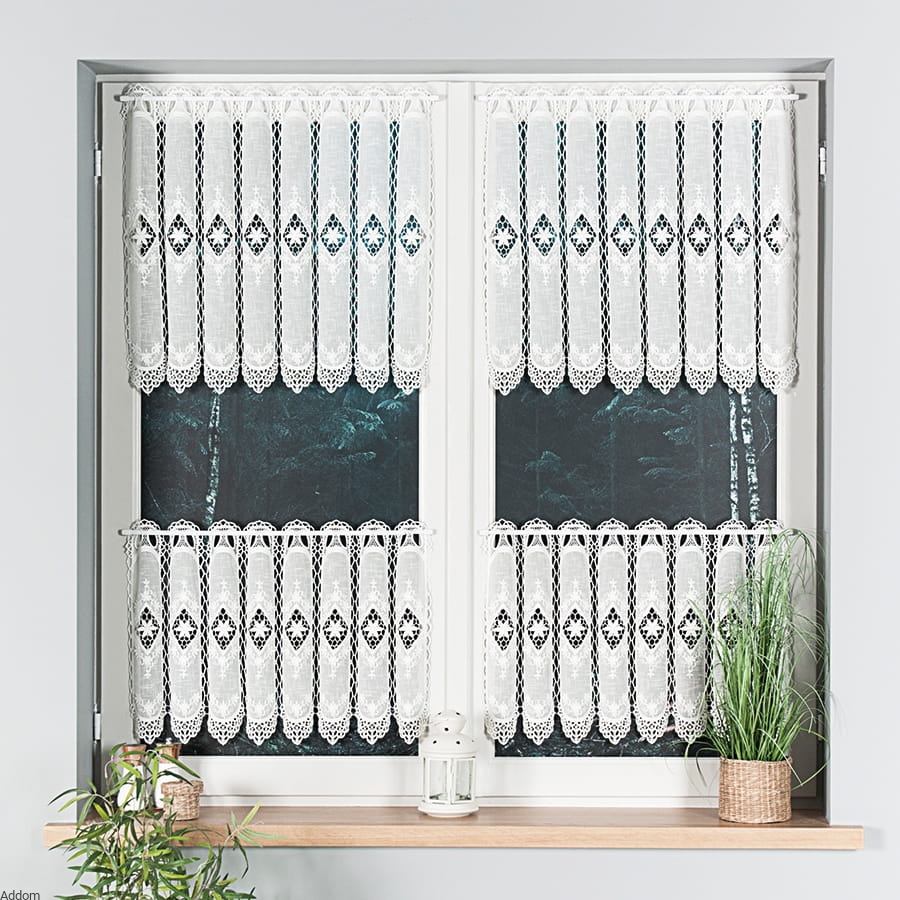 Krótkie firanki z haftem i gipiurą