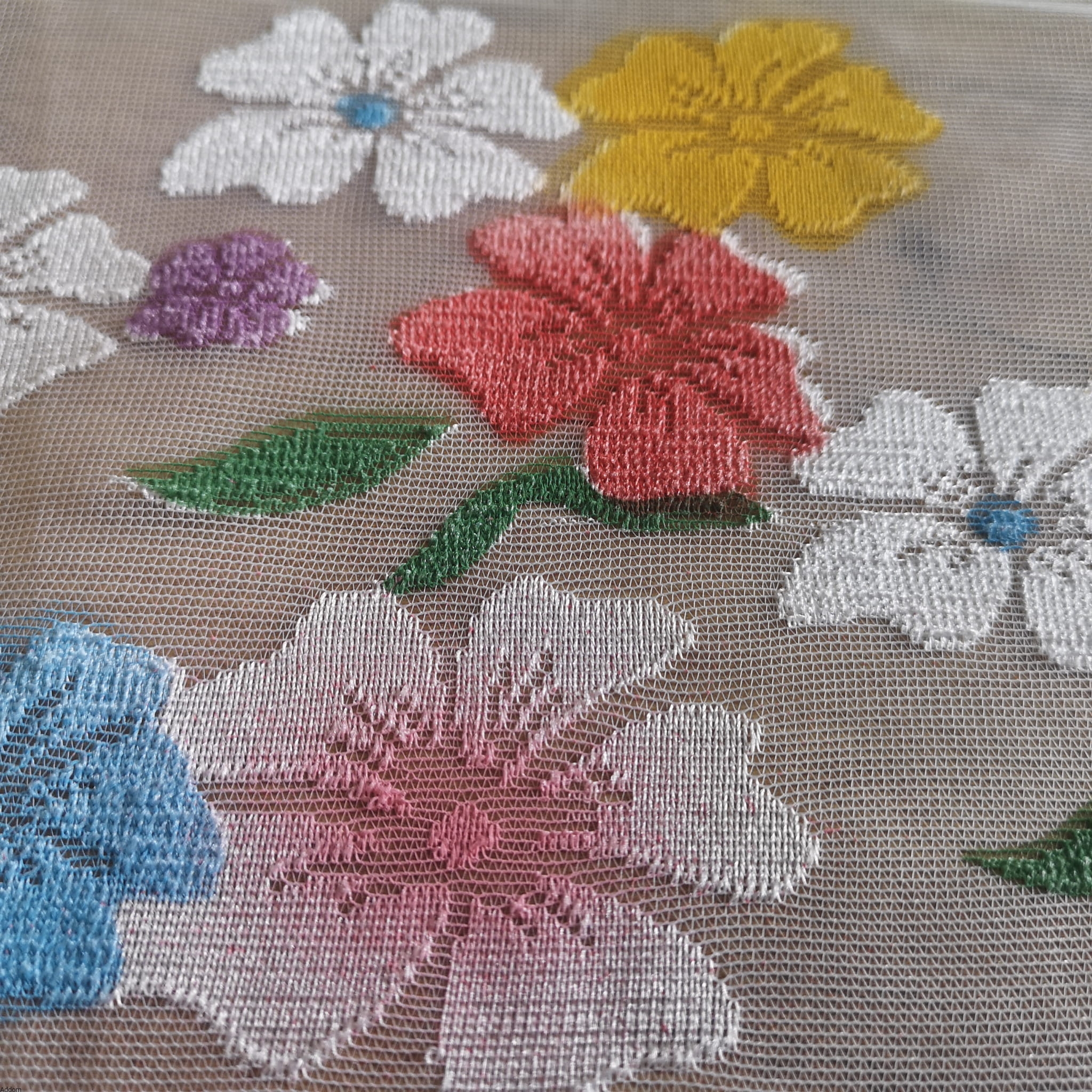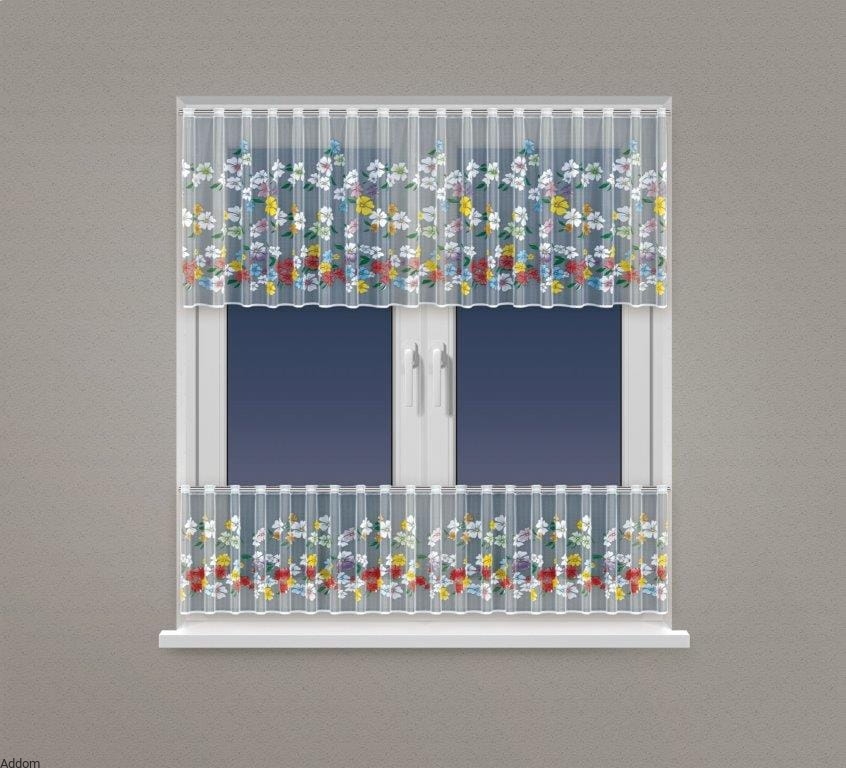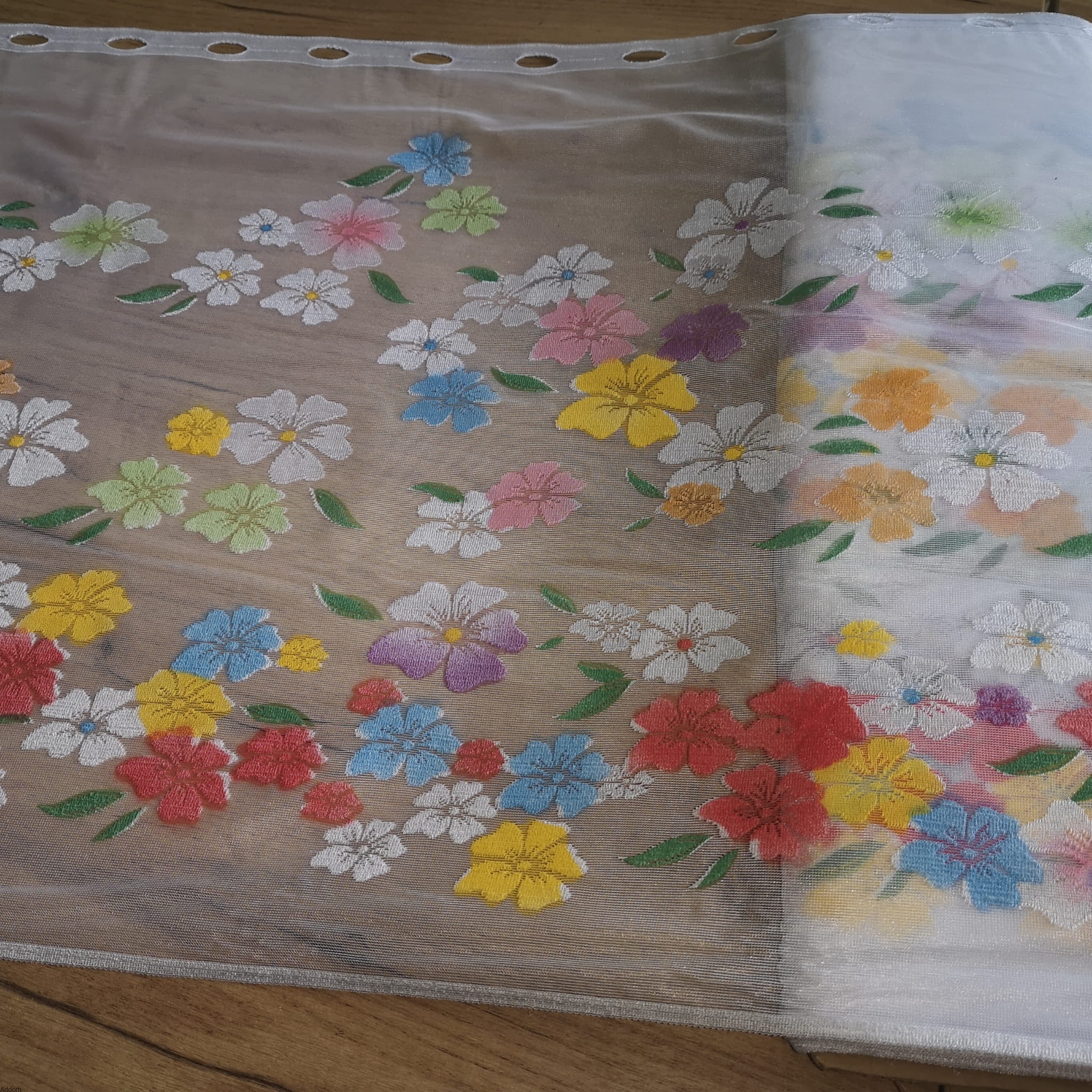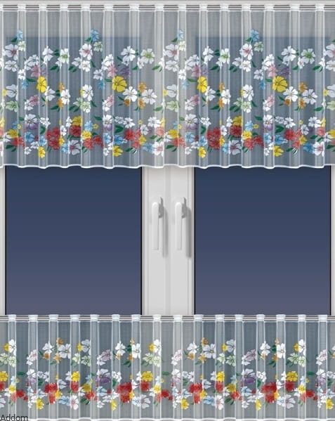 Krótkie, malowane firany typu zazdrostki do kuchni, które można kupić na wysokość 40 lub 60 cm. Firany te są w kwiaty typu kolorowe duże stokroteczki, malowane na kolor żółty, różowy, czerwony, turkusowy, i wiele innych kolorów, z zielonymi łodyżkami, a kolory są nakładane ręcznie wodoodpornymi farbami.