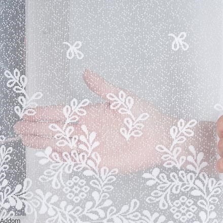 Firanki do kuchni, krótkie, z podcięciem dołem po łuku, o mlecznym, średnio przejrzystym wzorze, nad którym znajduje się wzór kwiatowy, składający się z małych kwiatuszków oraz listeczków. Wzór ten znajduje się tylko na dolnym obwodzie firany, górę zdobią malutkie kokardki.