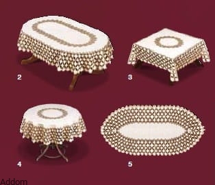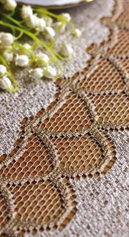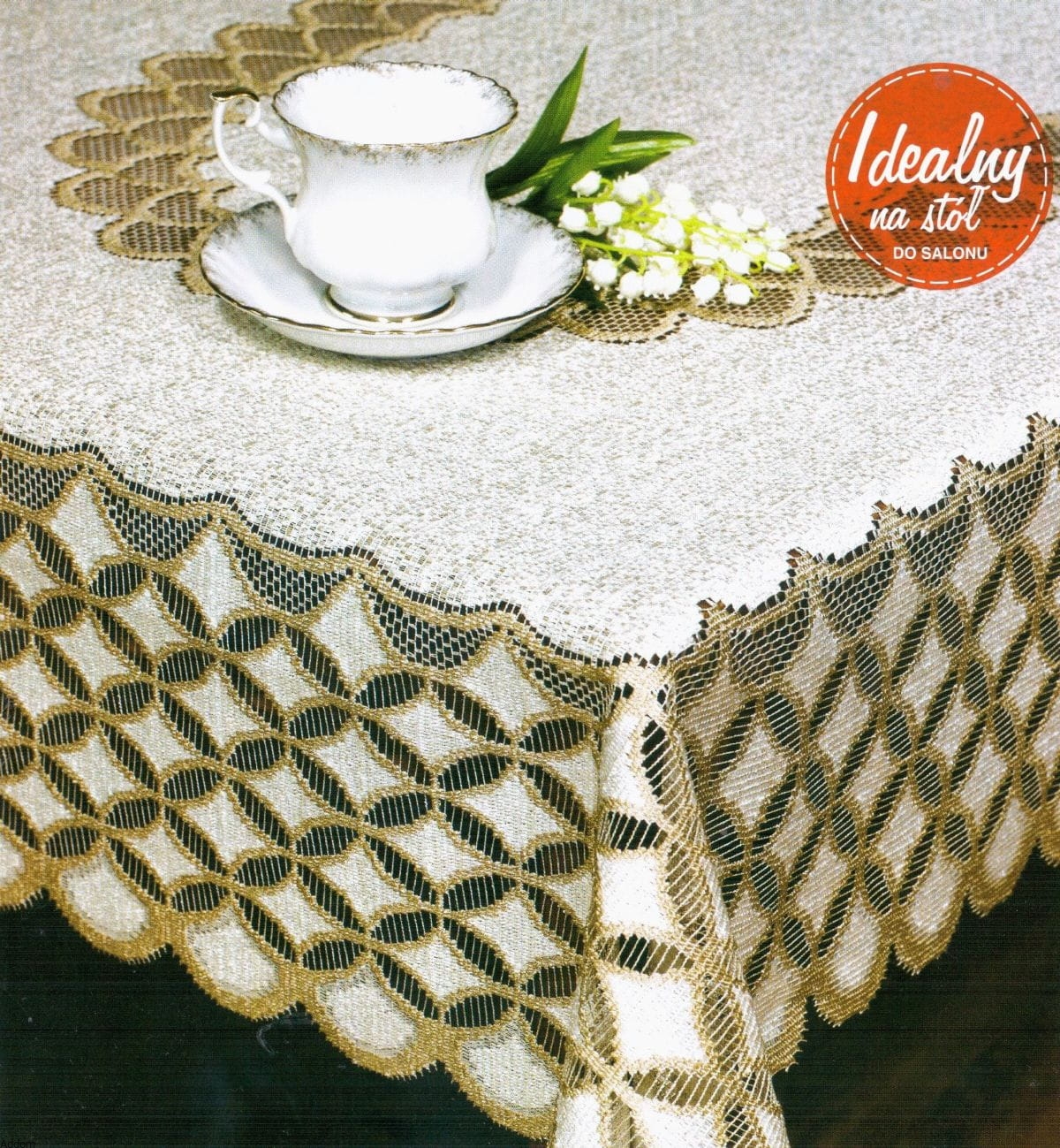 Obrusy dzianinowe, żakard z nici 2 kolorach, beżowej i złotej, o pełnym środku z beżowym ażurowym wieńcem z półprzejrzystych wachlarzyków.