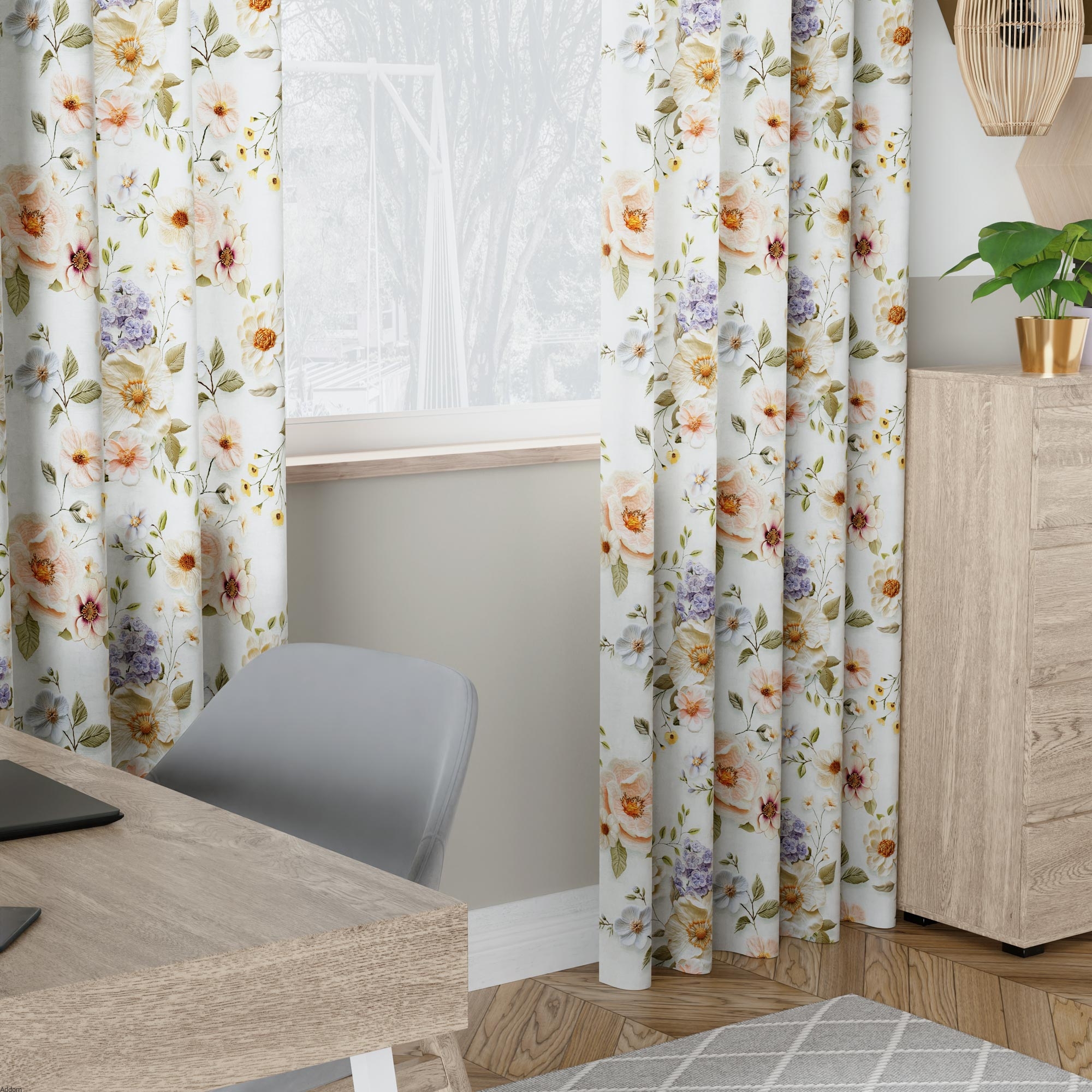 Tkanina ta nadaje się nie tylko na zasłony, można z niej wykonać także dekoracje stołu czy pokrowce na fotele i dostępna jest w 2 tonacjach: stonowanej i mocnej, wyrazistej. Kwiaty to dalie. Ten sam kwiatowy wzór co na tkaninie, kupić możecie również na poszewkach, bieżnikach i firanach.