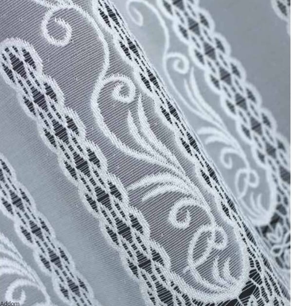 Lambrekin na metry, z gęstej dzianiny żakardowej i pięknym, łańcuszkowym ażurem, pomiędzy którym znajduje się roślinny wzór. Dół przypomina koronkę gipiurową, góra ma otwarte kółeczka, przez które przeciągnąć można rurkę karnisza. Misterny wzór oraz grubość firaneczki i gęstość ściegu to główne atuty tej dekoracji okiennej, należącej do Lux Collection Kaliskiej Fabryki Firan i Koronek, charakteryzującej się grubym, gęstym tłem, bardzo grubym obrysem wzoru i subtelnym ażurem, którego jest niewiele, ale połączony z wypukłym obrysem mocno przyciąga wzrok.