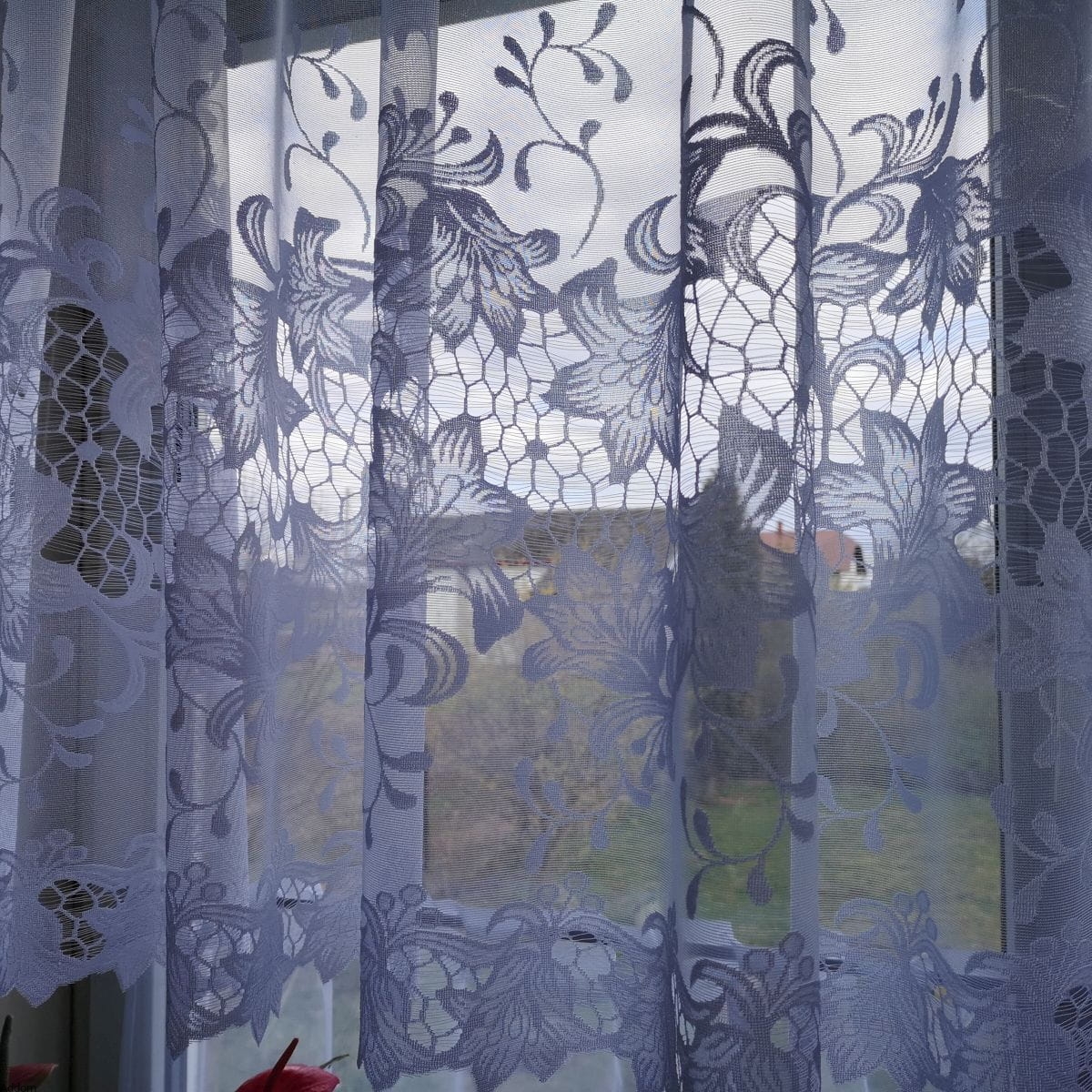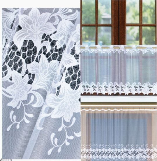 Przepiękny lambrekin żakardowy z kolekcji Trends, produkcji kaliskiej, wykonany jako żakard podobny do tkaniny, z gładziutkiej firany o zwięzłym splocie z cienkiej nici, o przepięknym, wyrazistym wzorze w lilie. Wariant o wysokości 40 cm ma mało wzorów, właściwie tylko dołem biegnie szlak wykończający firanę, natomiast warianty wyższe zawierają szeroki wzór w lilie zawieszone na mocnym ażurze z heksagramów - oczek plastra miodu.