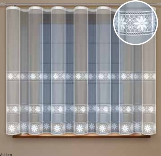 Lekkie firany gotowe z prostym dołem, z wzorem w formie paseczków poziomych, i dołem w formie szerokiego, dekoracyjnego pasa w kwiaty. Firany są żakardowe, w kolorze białym. W oknie firany są przejrzyste, nie zasłaniają widoku od wewnątrz. Firana jest miękka i lekka i , nie obciąży cienkiej rurki karnisza, a dzięki swojemu wyglądowi nie przypominającemu typowych firan żakardowych, pasować będzie nie tylko do rustykalnych, ale także do nowoczesnych wnętrz.
