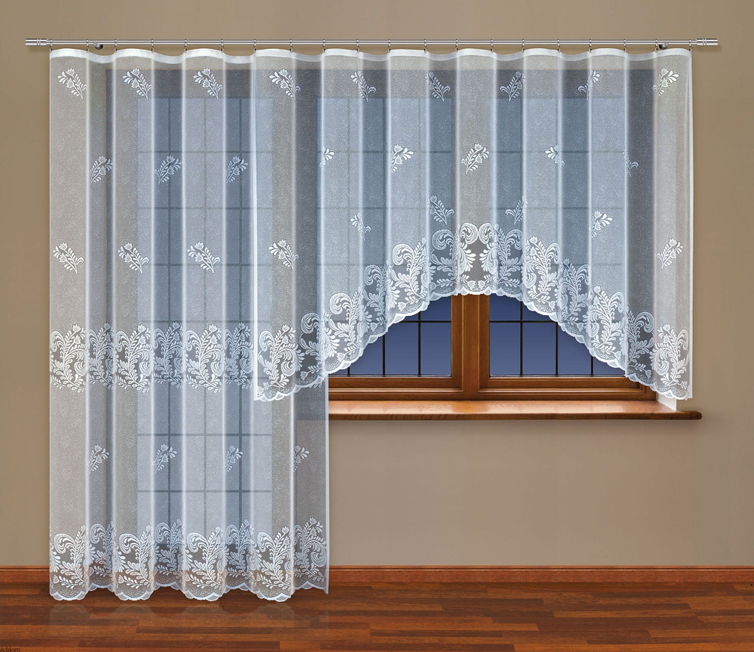 Firanki dość lekkie, matowe, o wzorze w paprocie i kwiaty, umieszczone głownie w dolnej części firan. Dostępne są wersje krótkie o wysokości 160cm i szerokości 300 lub 500cm, do parapetu, oraz wersja długa a wąska, do okien drzwiowych balkonowych. Do każdej wersji doszyta jest taśma marszcząca 2,5cm typu ołówek, a firanki sprzedawane są na sztuki, więc można zakupić dowolną ilość każdego wariantu.