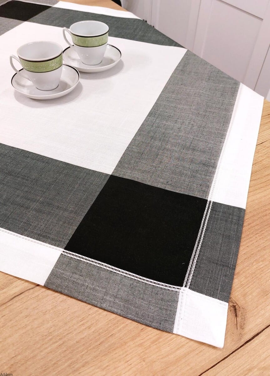 Obrusy kwadratowe z tkaniny jak lnianej, o wyglądzie lnu, w kolorze kości słoniowej oraz stonowanym kolorem po obwodzie i wymiarach 85x85cm. kolory po obrysie schodzą się w rogach, tworząc mocniejszy kolor na ich końcach.