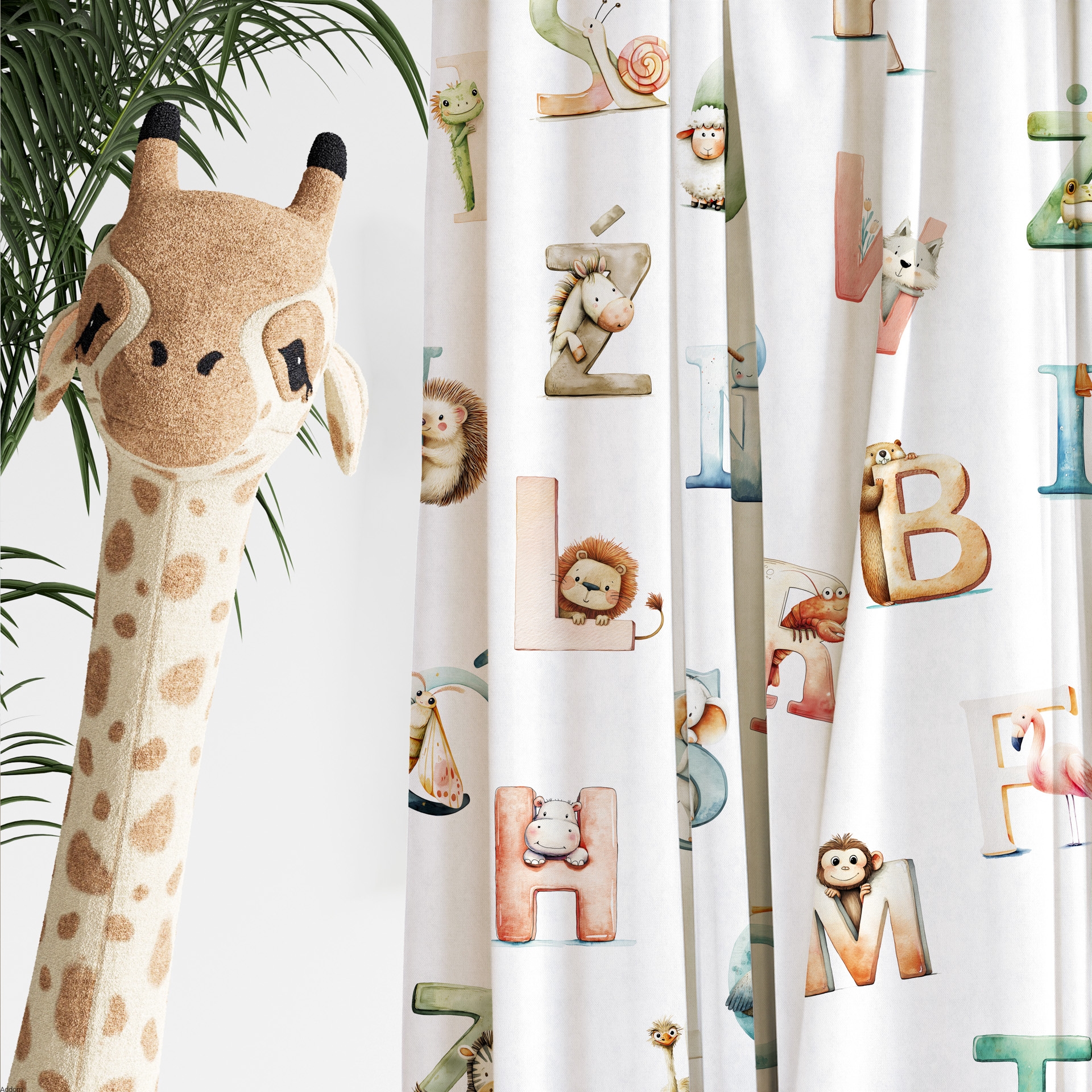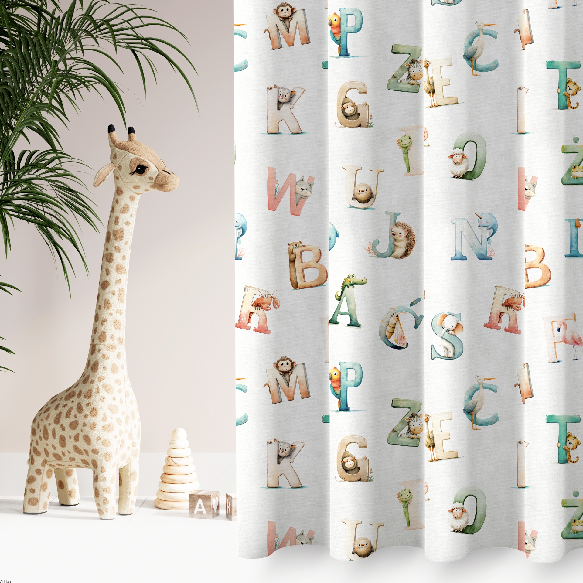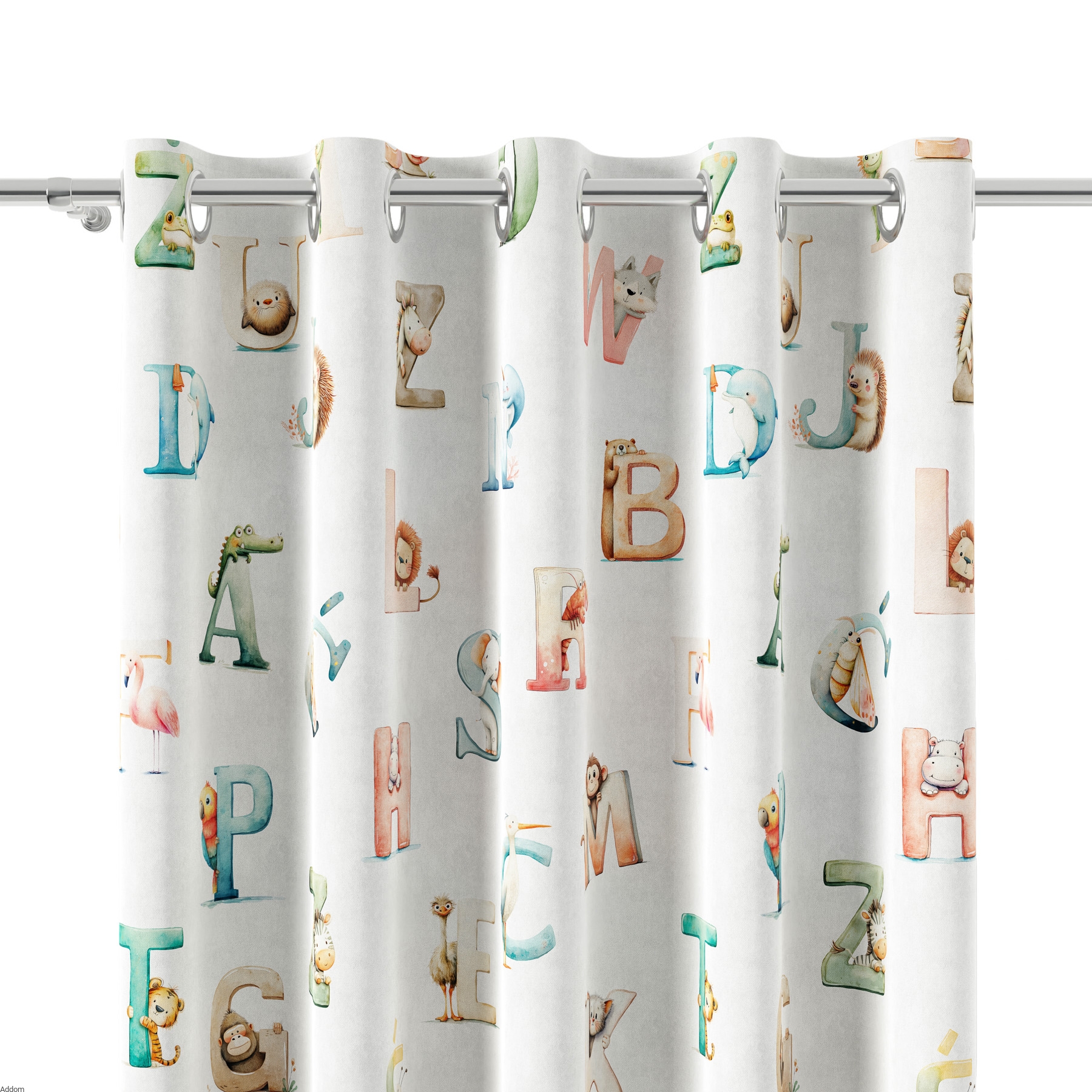 Materiał biały dobrze zaciemniający, w kolorowe literki i zwierzątka, nadrukowane z jednej strony tkaniny, od spodu materiał jest biały i odbijający światło. Tkanina zaciemniająca w 100%, gruba a jednocześnie lekka, to której dobrać można firanki i poszewki z tym samym motywem misiów. Brzegi tkaniny są wykończone ultrasonicznie i nie wymagają obszywania.