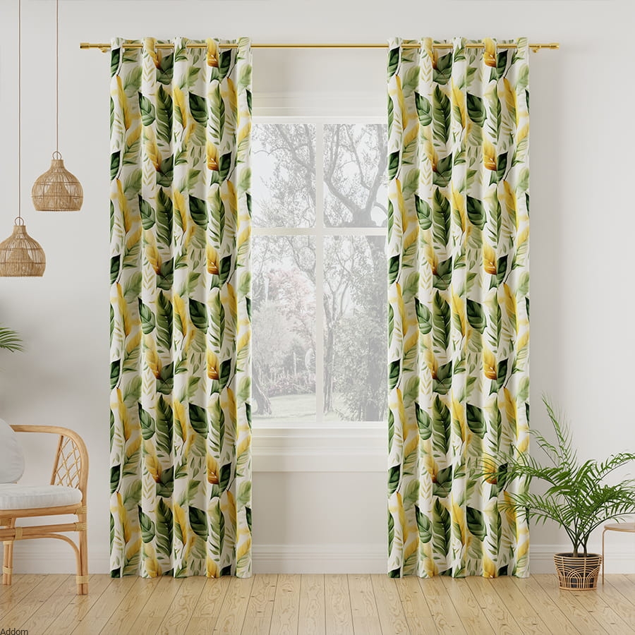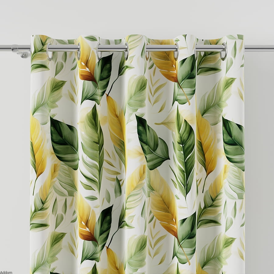 Materiał na zasłony w kolorze wyrazistej zieleni i żółci, z gęstym nadrukiem w roślinność lasu deszczowego - liści palm bananowca. Szerokość tkaniny to 150 cm, jest on aksamitny jak roślinność dżungli, lejący, a grafika sprawia, że patrzenie w kierunku okna będzie działać relaksująco oraz da odpoczynek oczom, nawet, jeśli za oknem brak relaksującej zieleni drzew. W produktach powiązanych (zakładka) znajdziecie Państwo produkty zebrane w obrębie tematyki City / Urban Jungle, spośród których dobierać można dodatki pasujące tematycznie do tej stylizacji.