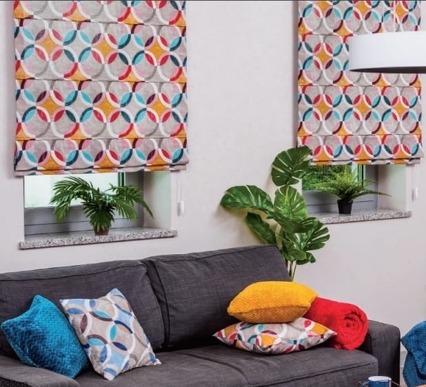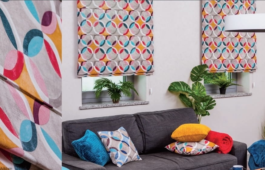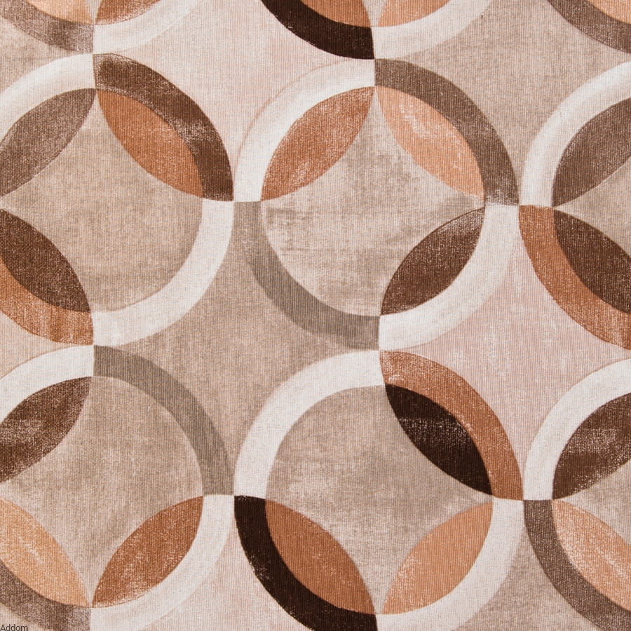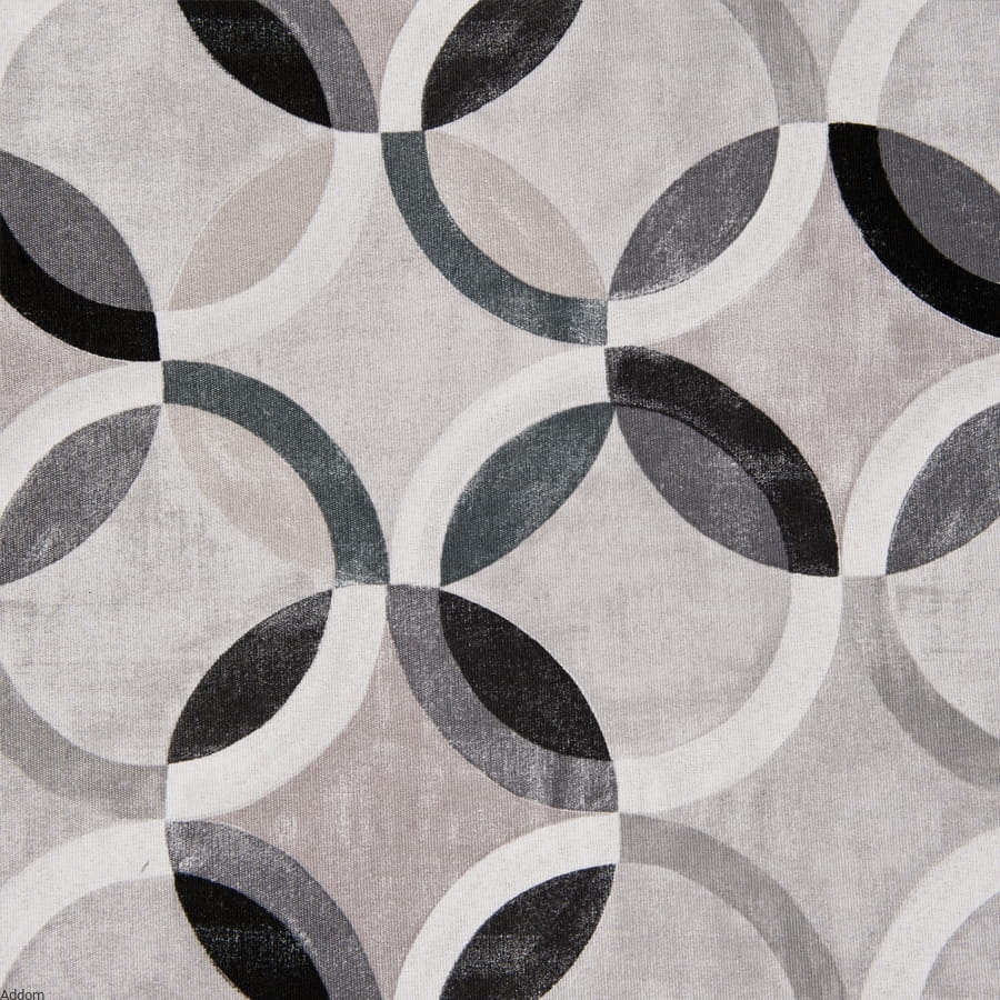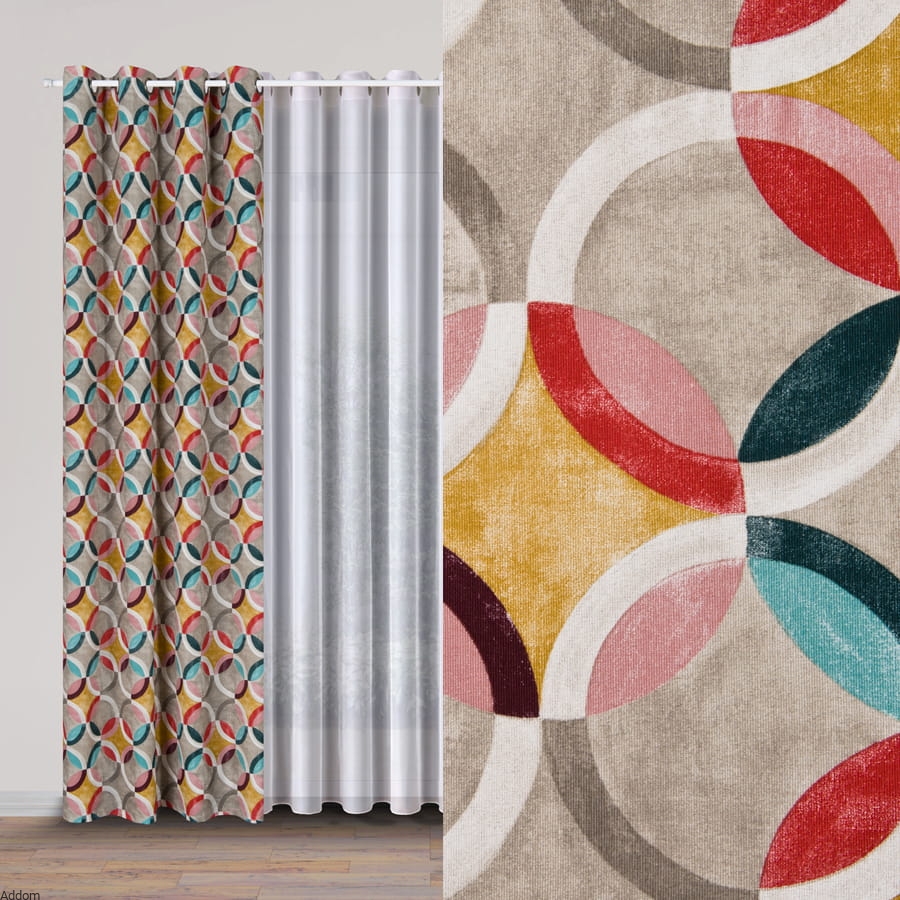Gruby i lekko sztywny materiał bawełniany na zasłony, o beżowym tle, w kolorowe kółeczka. Tło każdej wersji jest beżowe, wygląda jak ręcznie malowane, na nim umieszczona jest grafika zachodzących na siebie kółeczek, w kilku wersjach kolorystycznych, w tym jedna jest najbardziej kolorowa, bowiem zawiera kilka kontrastujących kolorów, inne są utrzymane w odpowiedniej tonacji, i tak wersja niebieska, na przykład, zawiera zarówno elementy koloru granatowego, jak i błękitnego czy turkusowego. Szerokość zasłon 140 cm, materiał to w 70% bawełna. Zasłony bawełniane należy prać w niskich temperaturach, aby ograniczyć ich kurczliwość, jaką może spowodować wysoka temperatura.
