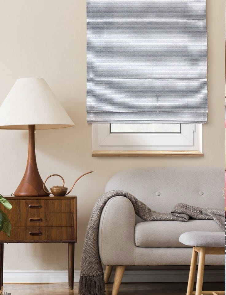 Na powyższej fotografii widzimy aranżację z zastosowaniem tkaniny w prążki oraz jednobarwną tkaninę tego samego typu, którą umieściliśmy w produktach powiązanych, aby szybko mogli Państwo dobrać jednobarwne dodatki do materiału. Materiały te są średnio grube i idealnie nadają się na rolety.