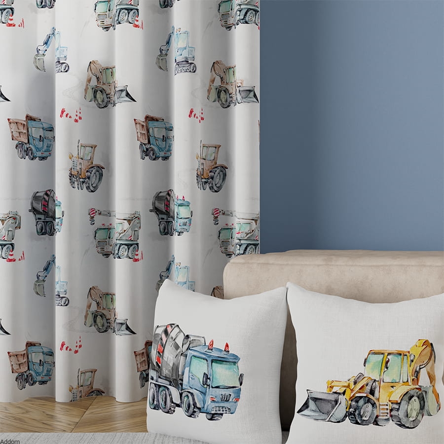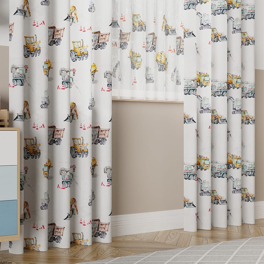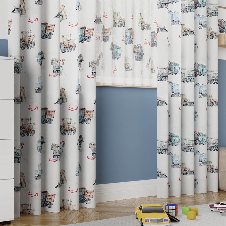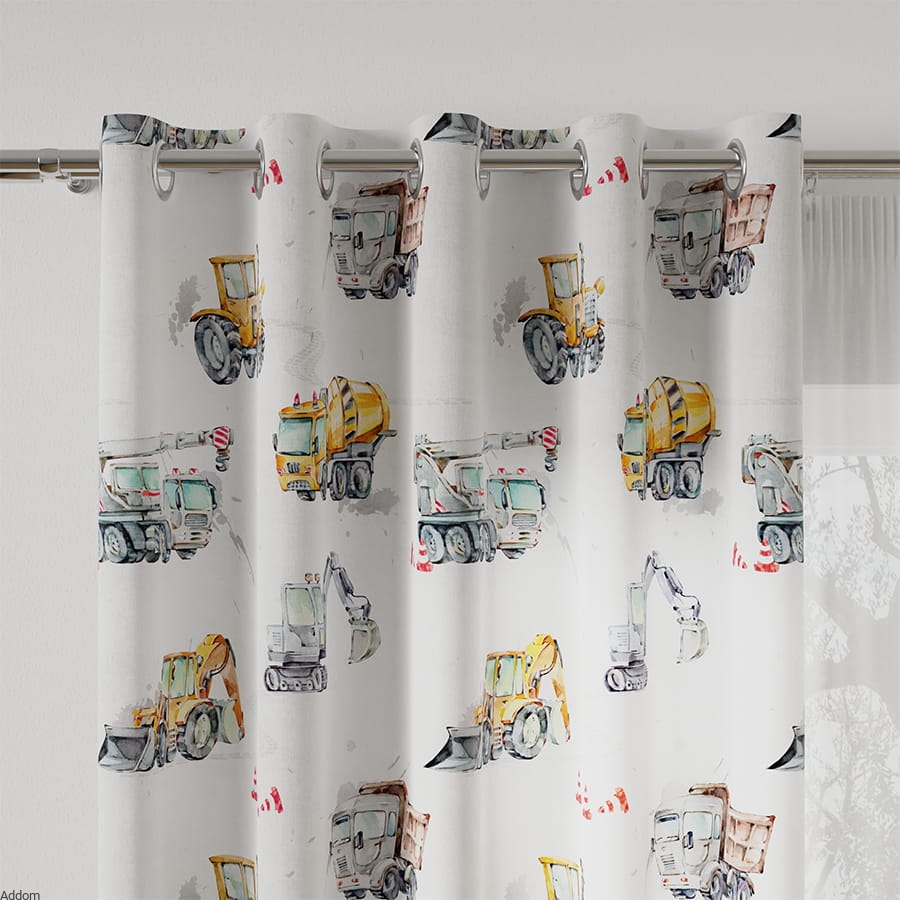 Materiał zasłonowy o szerokości 140cm, średnio gruby jednak dość dobrze zacieniający, mimo, ze lekki. Tkanina jest biała, a na niej umieszczone są stare samochody budowlane - wywrotki, koparki, spychacze, dźwigi, betoniarki. Motywy te powstały z myślą o pokojach dziecięcych, jednak ich wzornictwo nie jest bajkowe, przedstawia spracowane podczas pracy pojazdy, dlatego mogą być też pomysłem do udekorowania biur firm transportowych czy budowlanych. Na pewno każdy zapamięta tak wyróżniającą się firmę.