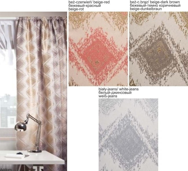 Materiał na zasłony w błyszczące lekko wzory typu romby, ale bez wyrazistych ostrych brzegów, są one zmiękczone luźnym ułożeniem farby wokół wzorów, dzięki czemu zyskują łagodności i przytulności. Na całości romby te tworzą pionowe szlaki, a każda wersja kolorystyczna została ubogacona kolorem złotym lub srebrnym. Tkanina szerokość 170 cm, polskiej produkcji, kolekcja Górskie Szklaki, inspirowana kamienistymi wzgórzami.