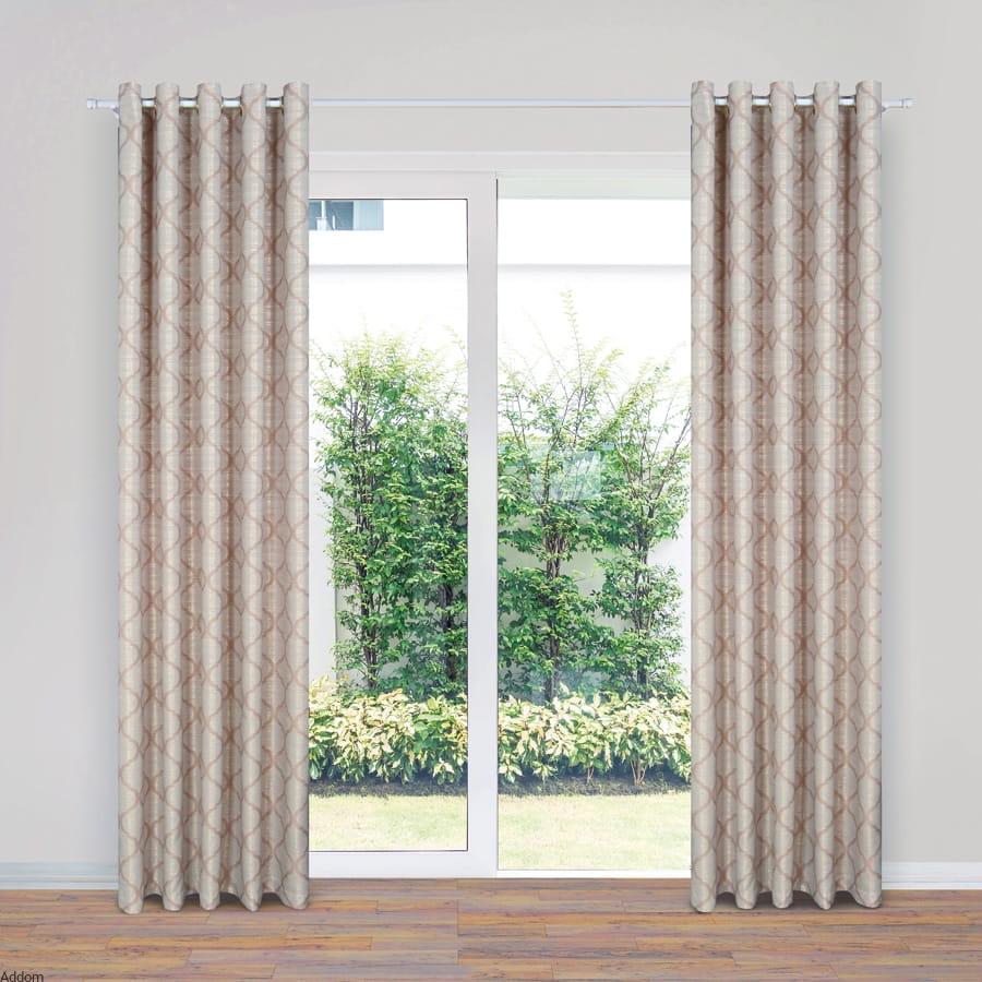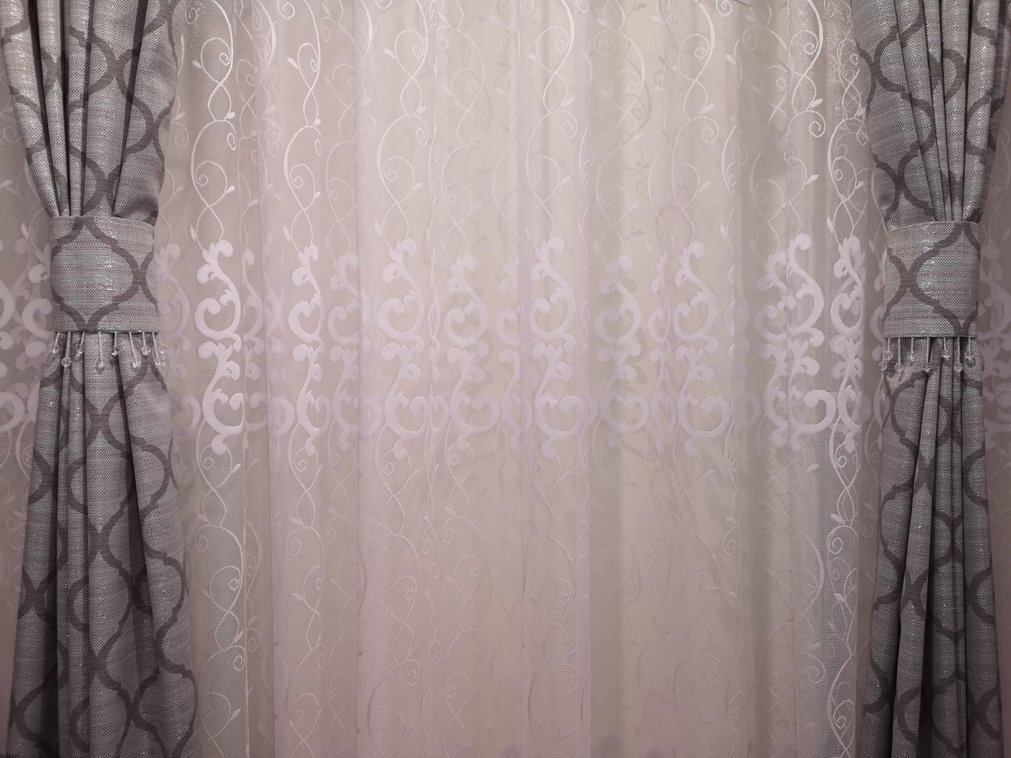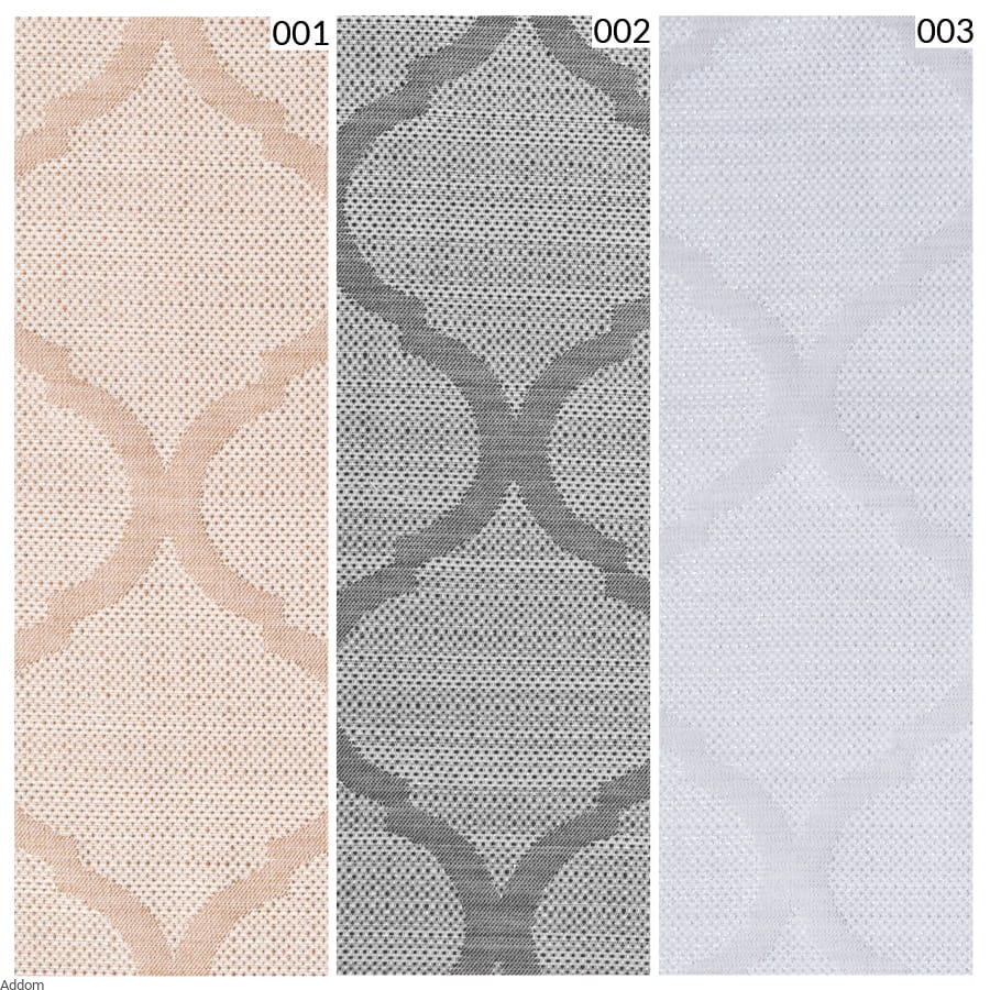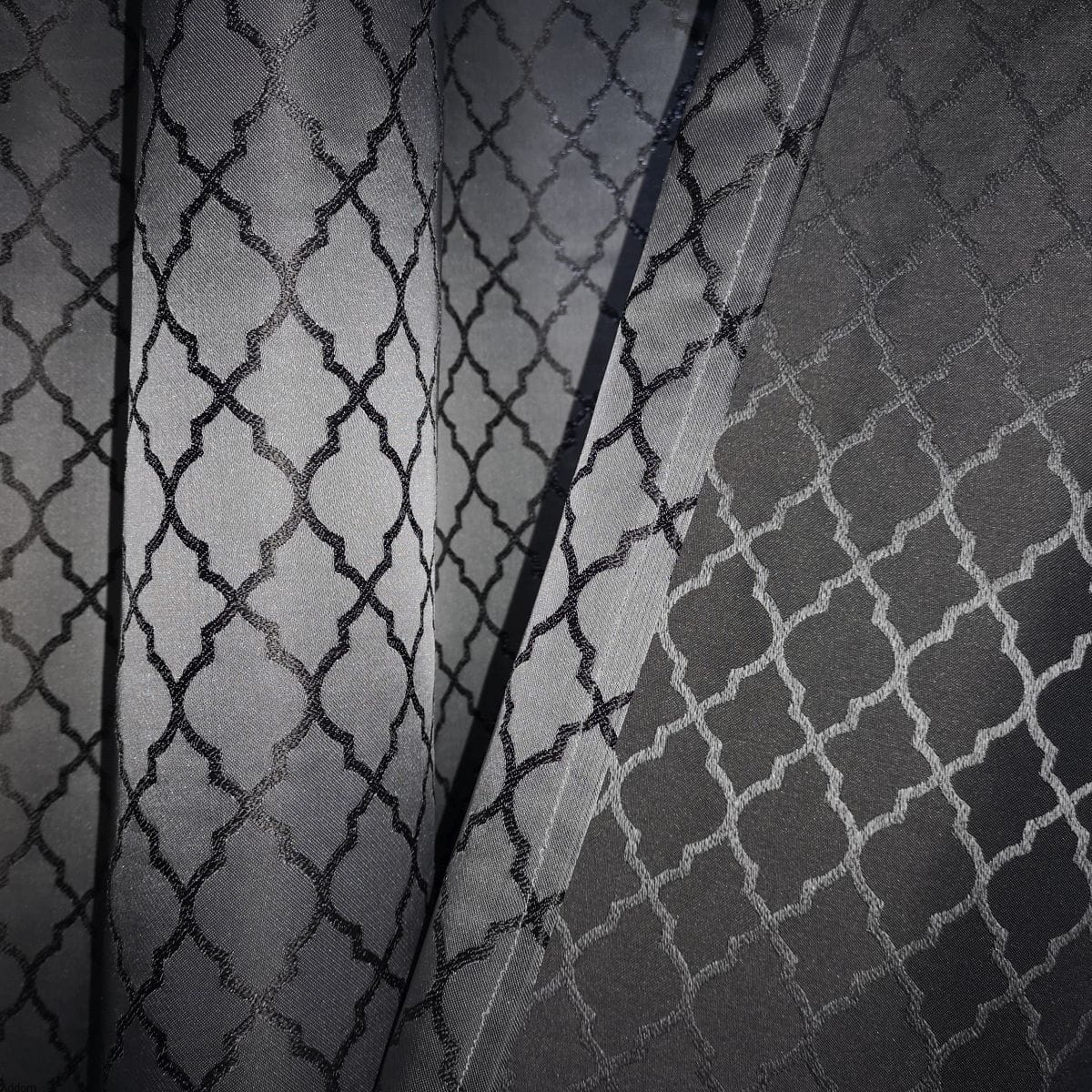 Materiał zasłonowy dwustronny, w którym jedna strona jest negatywem drugiej strony. Materiał dobrze zasłaniający, z połyskiem uwidaczniającym się do światła. Tkanina ta ma 150 cm szerokości, i zdobi ją orientalny wzór, odznaczający się od tła.