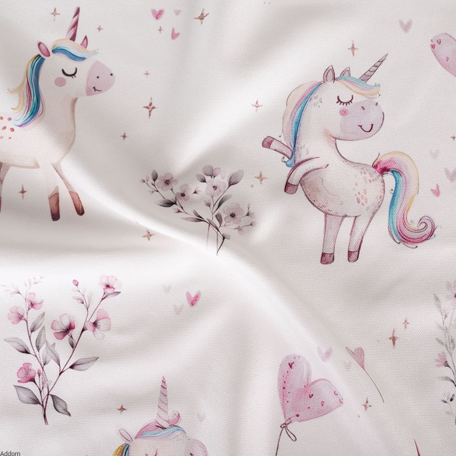 Materiał zasłonowy w jednorożce wyróżnia się uroczym wzorem przedstawiającym jednorożce w różnych kolorach i pozycjach, rozmieszczone na delikatnym tle. Ten wzór dodaje wnętrzu radości i fantazji, czyniąc go idealnym wyborem dla dziecięcych pokoi, ale także dla każdego, kto kocha magiczne stworzenia. Jasne, pastelowe odcienie wprowadzą do pomieszczenia świeżość i lekkość, jednocześnie nie przytłaczając wnętrza.