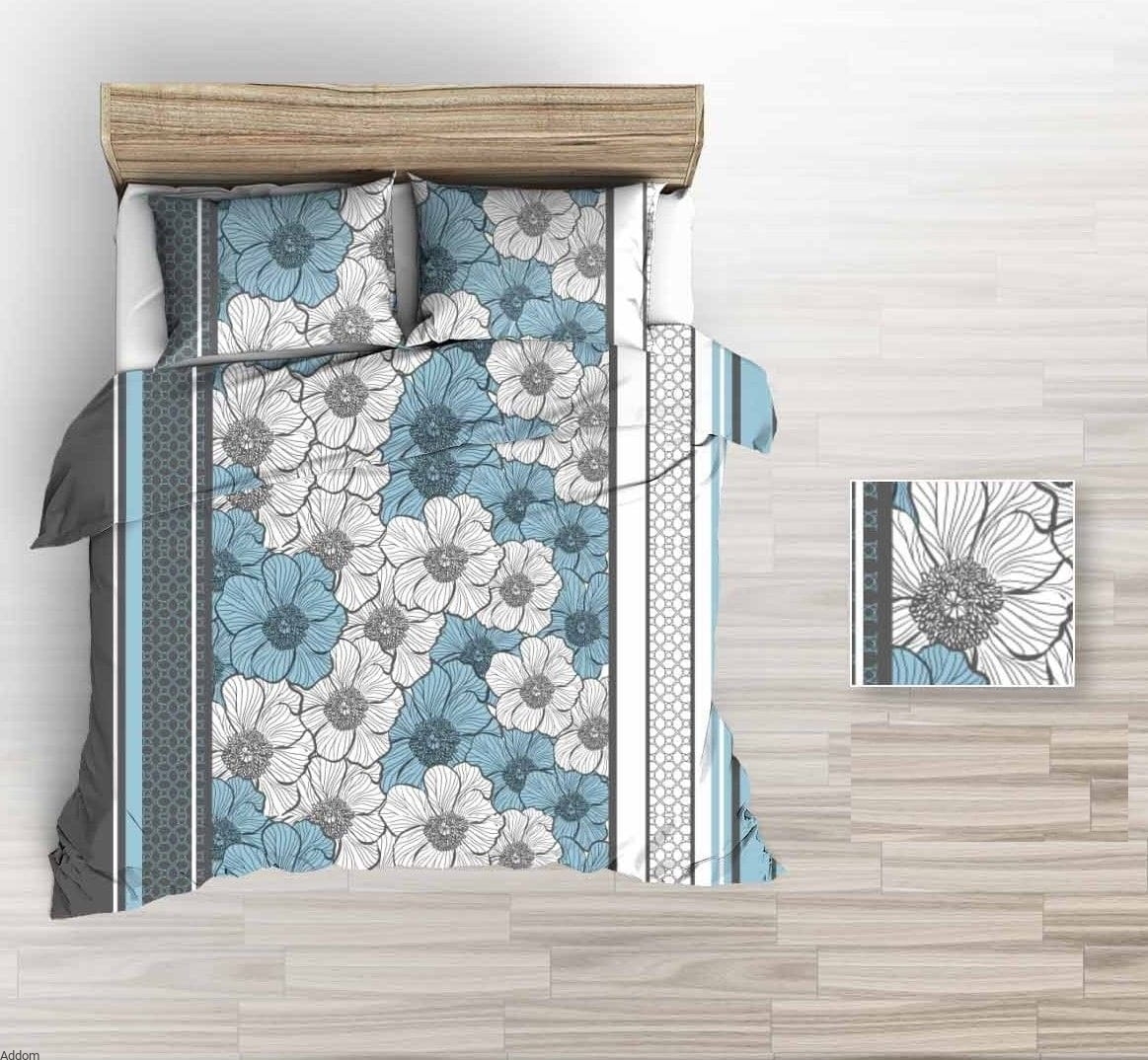 Pościel z kwiatami w kolorze jasnego niebieskiego koloru umieszczonymi na jasnym tle, z poszwą w rozmiarze 160x200 albo 200x220, która to zawiera dodatkowe pionowe pasy po bokach. Prosimy wrócić na to uwagę, że obydwa rozmiary różnią się nieco od siebie, co prezentujemy na zdjęciach.