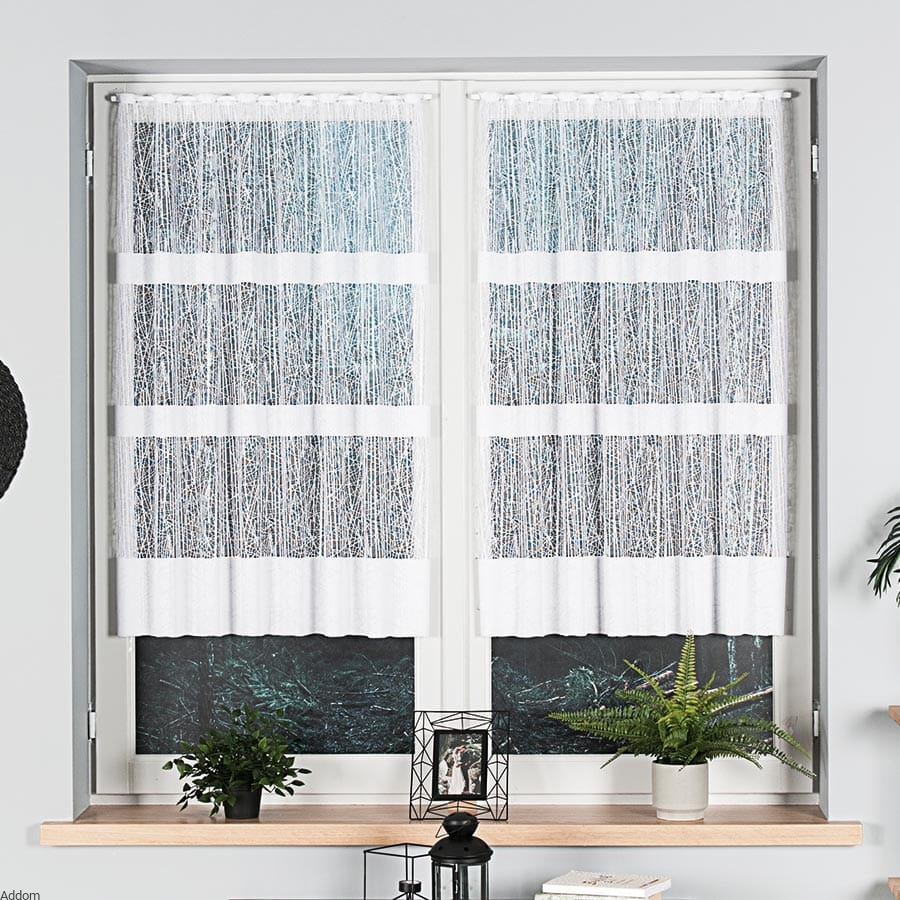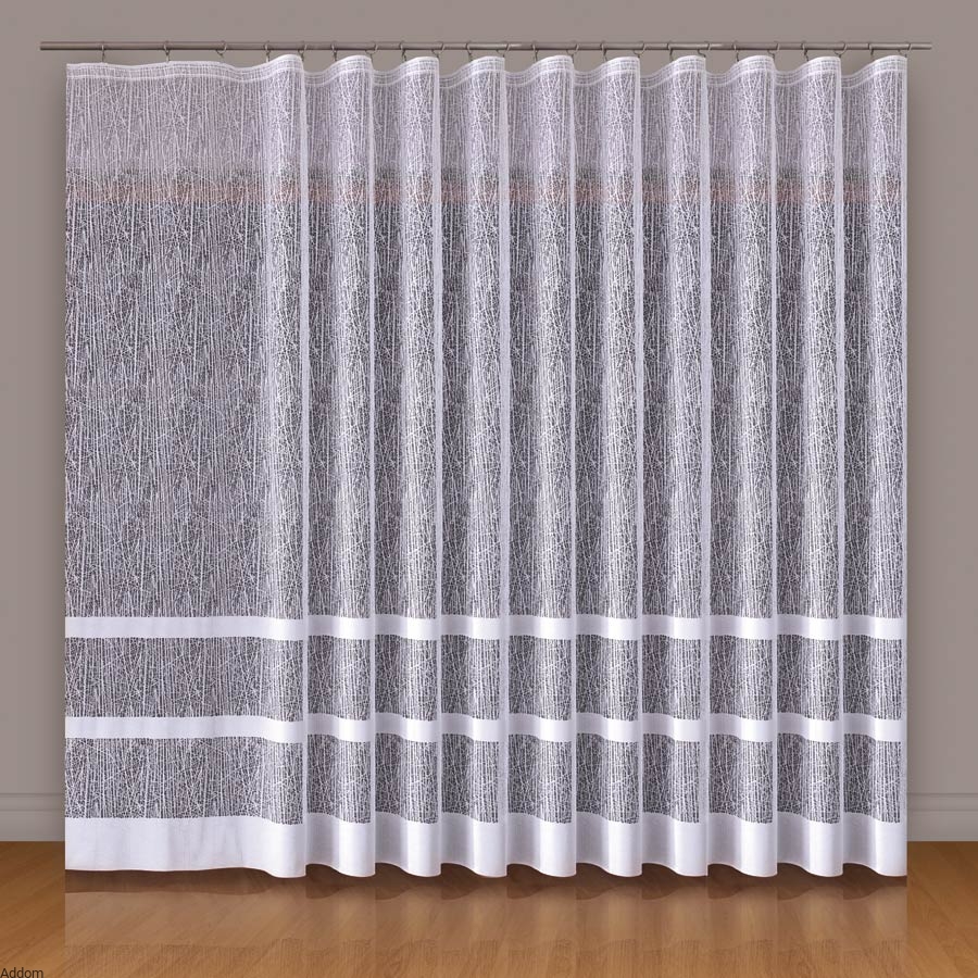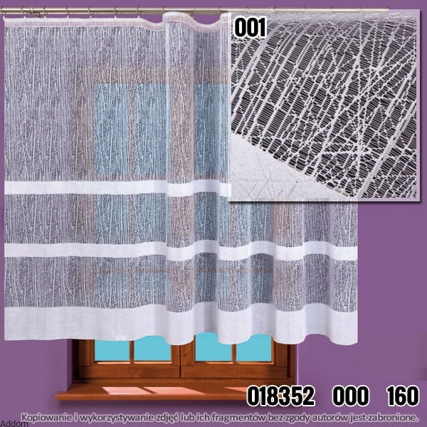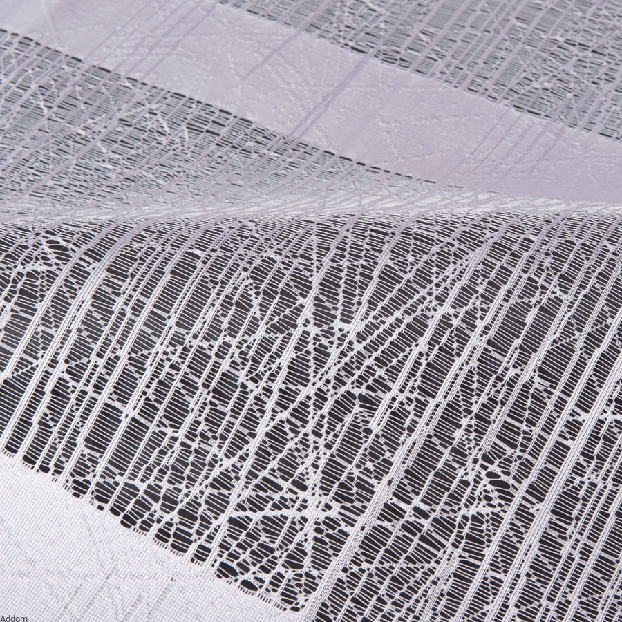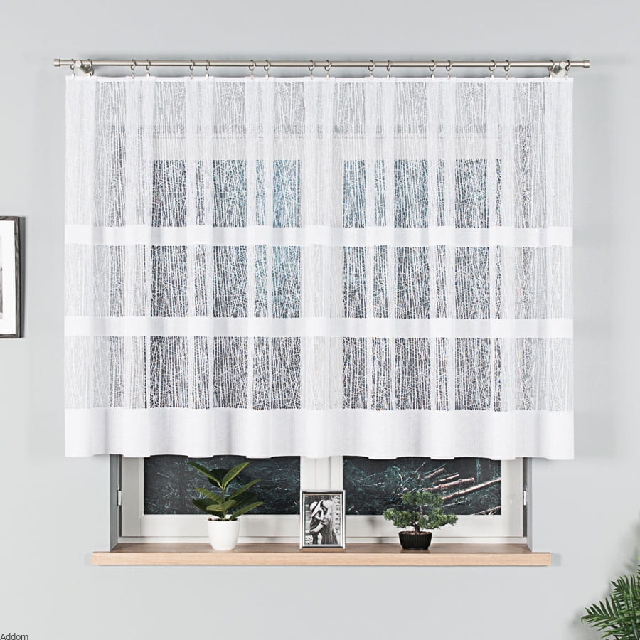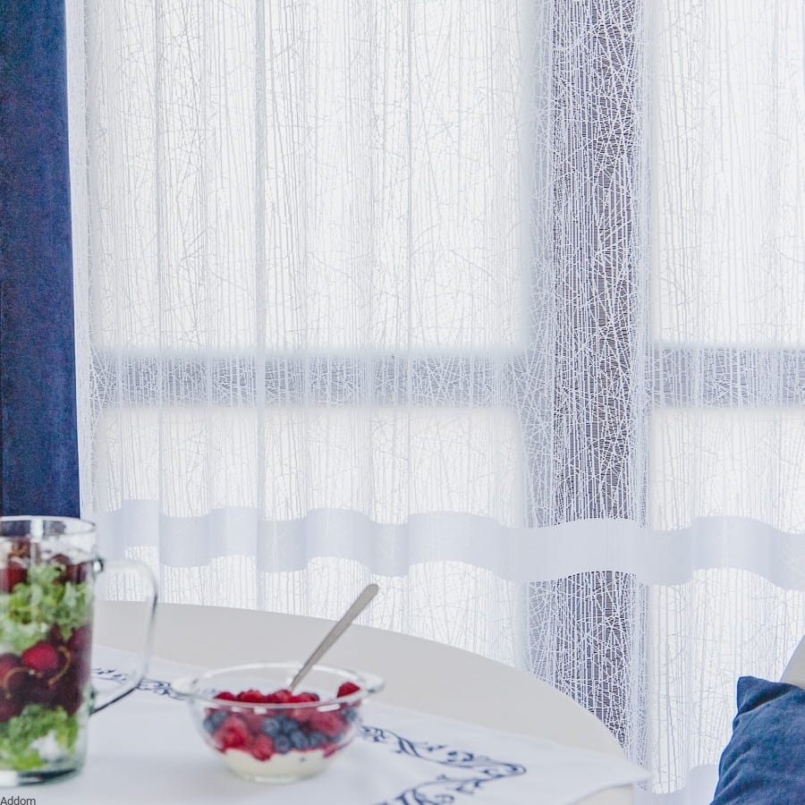 Firany metrażowe o nietuzinkowym, nowoczesnym design, w tłem wyraźnym strukturalnym, żakardowym, wyglądającym jakby tło tworzyły siły natury, mróz i deszcz, dołem natomiast znajdują się trzy paski. Firanki z efektem tła typu mróz są żakardowe i sprzedajemy je na metry, w wersji firan krótkich i długich, a można też kupić ten model jako gotowy, z falą dołem. Firany te zaprojektowano z myślą o najnowszych trendach dekoracyjnych, idealna do nowoczesnych aranżacji. Firanki te zadziwiają, przyciągają wzrok, a pasują szczególnie do nowoczesnych wnętrz. Są łatwe w utrzymaniu i nie muszą być prasowane.