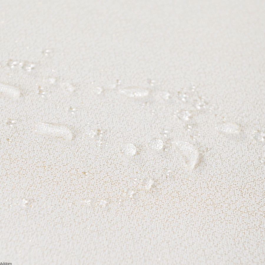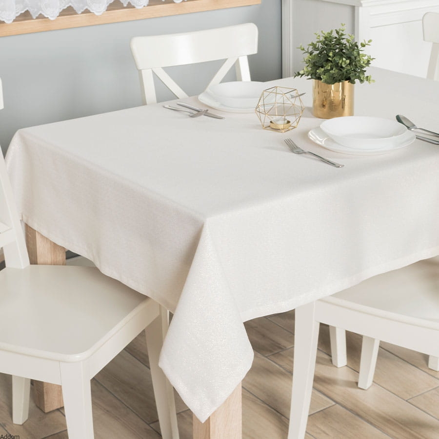 Nowoczesny obrus w kolorze złotym, w którym drobny wzór wykonany jest złotą nicią prowadzoną w innym kierunku niż kierunek układania nici tła. Tło jest białe a przędza dodatkowa jest złota, połyskuje mocno do światła całym bogactwem złota. Obrus wygląda jak kremowo złoty, a gra światła sprawia, że wygląda wyjątkowo ekskluzywnie.