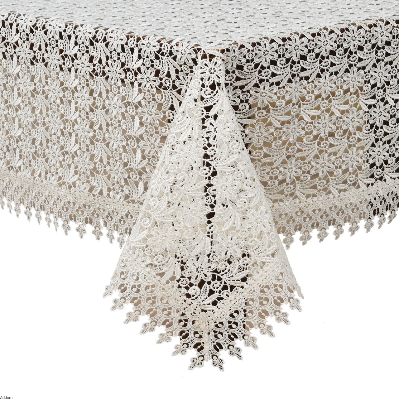 Na zdjęciach wariant biały obrusu przedstawiliśmy na stole okrągłym o średnicy 60 cm. Wariantu w kolorze złotym chwilowo brak. Wariant w kolorze beżowym zaprezentowany jest na stole kwadratowym o wymiarach blatu 60x60, ma on nieco inny wzór niż wersje białe, kremowe i złote - posiada same listeczki bez kwiatów.