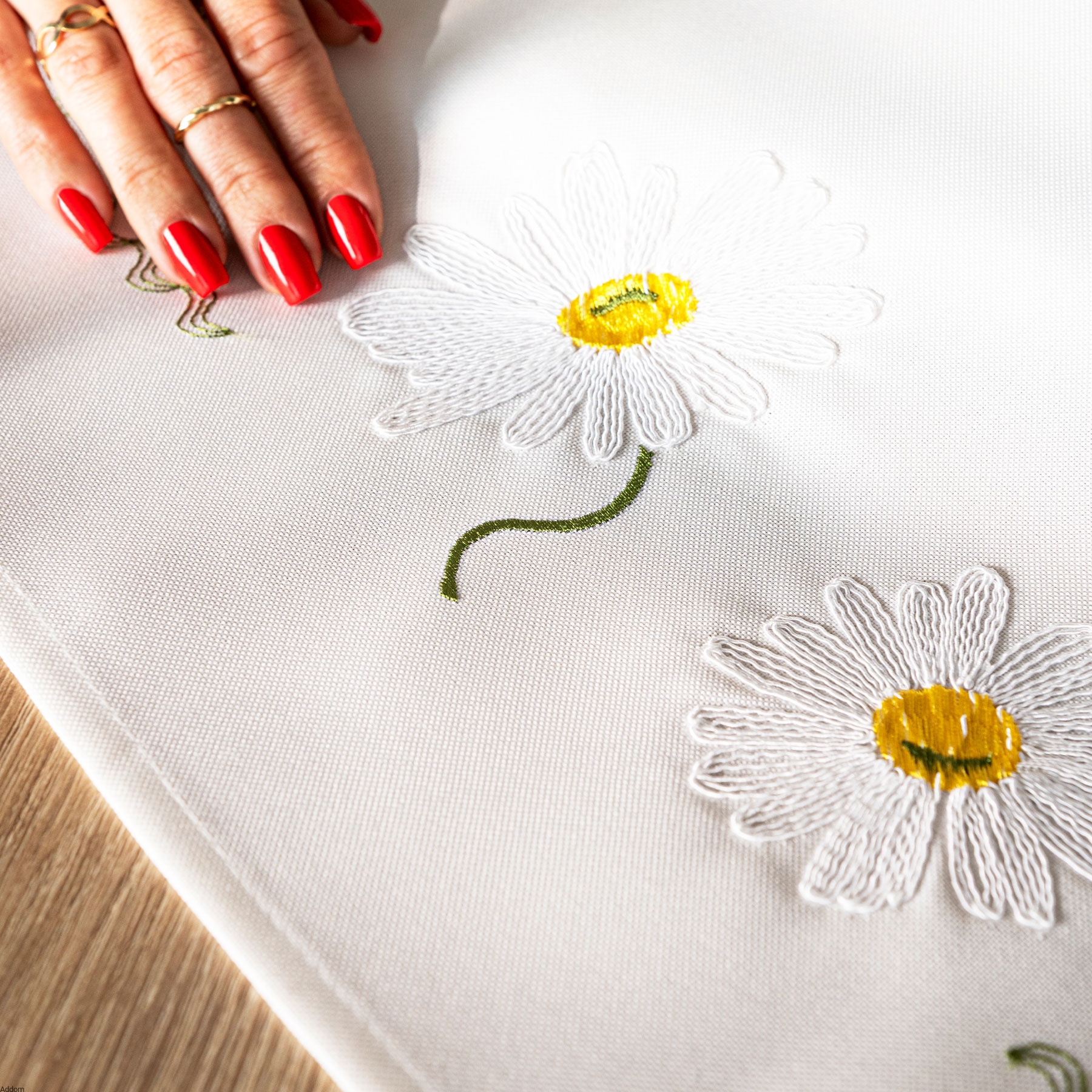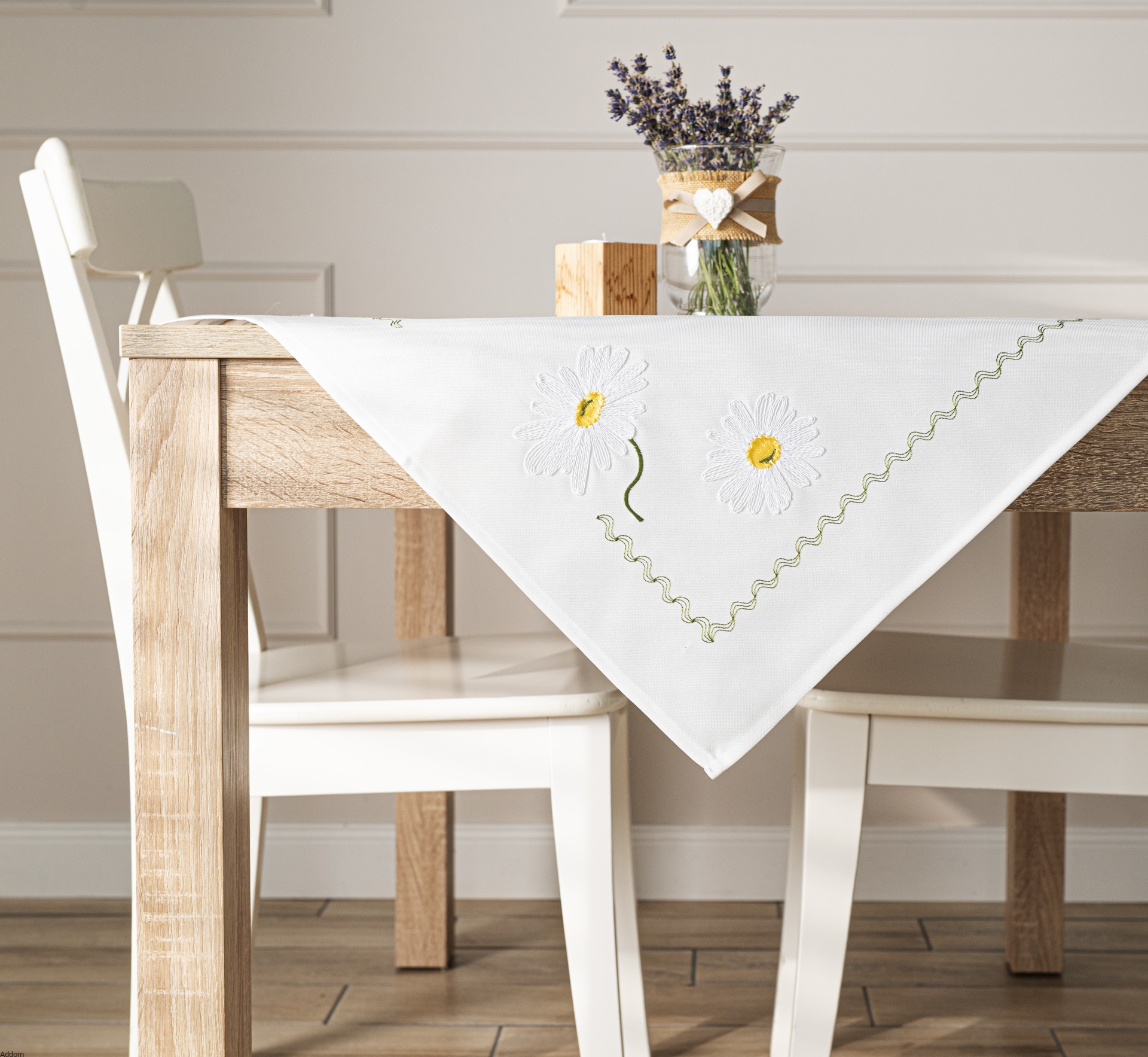 Kwadratowy, tkaninowy obrus o wymiarach 85x85 lub 110x110 cm, obszywany i haftowany błyszczącą nicią po wierzchu tkaniny. Obrusy w kolorze białym, kwiaty w kolorze żółtym, wypełnione bardzo połyskującą nicią. Kwiaty rumianków bardzo precyzyjnie wyhaftowane.