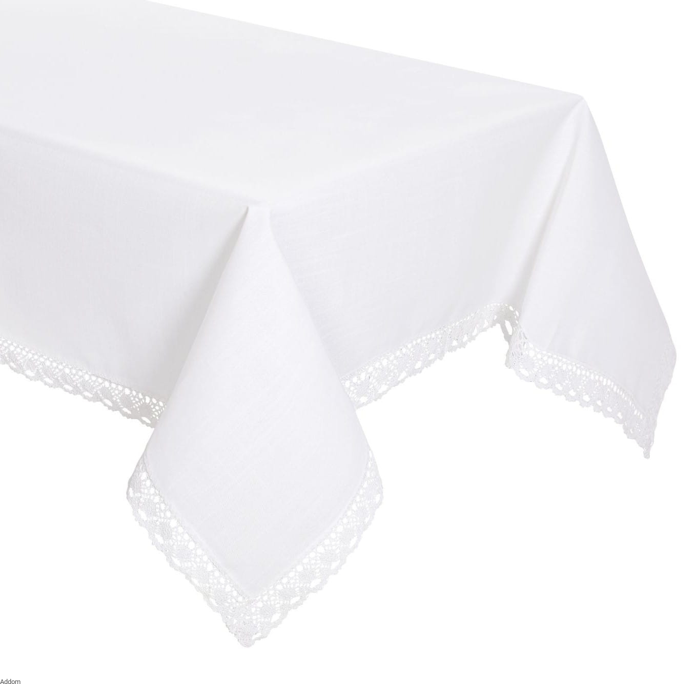 Obrusy wykonano z bawełnianego, grubszego materiału obrusowego, na 4 brzegach tkaniny doszyto szeroką, bawełnianą koronkę szydełkową, a środek jest bez zdobień.