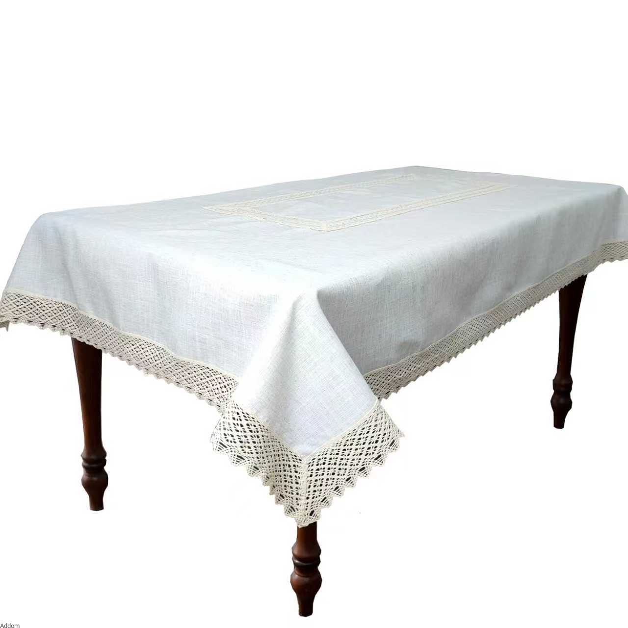 Obrusy lniano - poliestrowe z koroną, o bardzo naturalnym wyglądzie. Obrus o kształcie prostokątnym z obszyciem z bawełnianej, beżowej koronki. Koronka w kolorze ecru jest również naszyta na wierzchu obrusa. W zakładce z produktami powiązanymi zamieściliśmy nie tylko poszewki z tego samego stylu, ale również inne obrusy i poszewki, które został wykonane z tkanin lnianych i len-podobnych, i można je łączyć w serie.