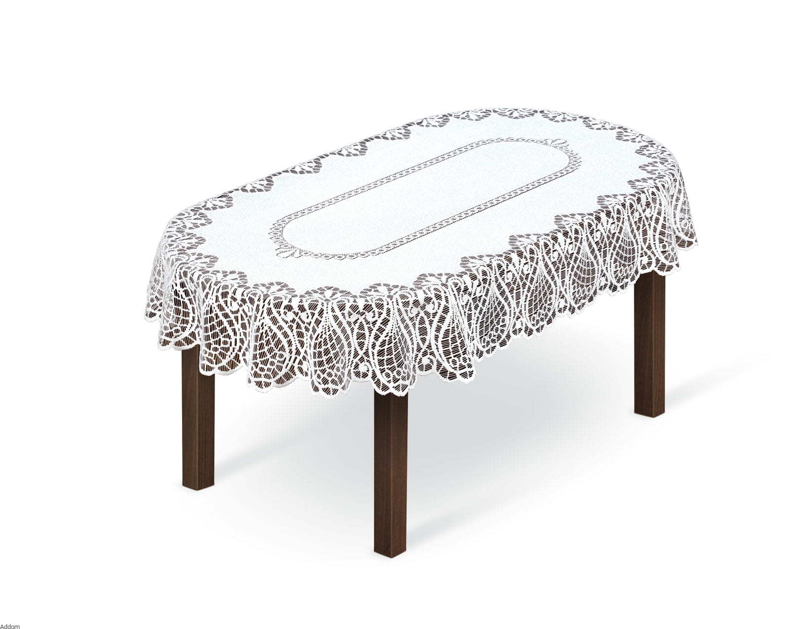 Obrus o przejrzystych bokach, żakardowy, z prześwitującym, nowoczesnym wzorem ażurowym wokół pełnego środka o falowanym brzeżku na łączeniu części ażurowej z pełną częścią. Przejrzystość szerokich boków może być zaletą w przypadku, gdy mamy stół o ładnych nogach i brzegach, i nie chcemy ich zakrywać zbyt mocno, taki ażur też dodaje obrusom lekkości. Do obrusu dobierzesz u nas również serwetki i bieżniki.