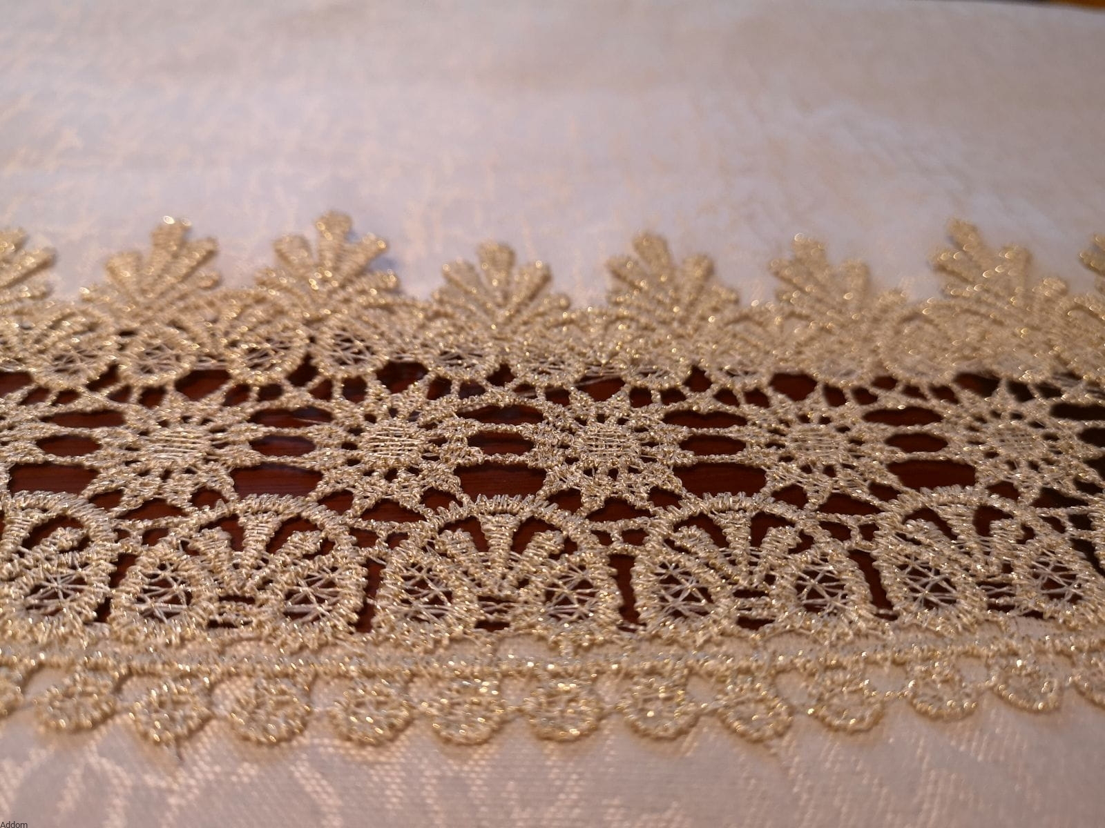 Złoty obrus gipiurowy, obszyty złotą 10 centymetrową gipiurą, która zawiera w sobie złotą, połyskującą nić, mieniącą się do światła. Wstawka z gipiury wszyta na środku między 2 elementy materiału, przez co widać kolor stołu, stanowi on tło dla złotej gipiury. Tkanina jest w tonacji ciepłego, mocniejszego ecru i pasuje wszędzie tam, gdzie kolory złota i ecru uzupełnią aranżację. Obrusy należą do bardzo eleganckich i wykwintnych, są starannie uszyte. Obrusy te nie nazywamy plamoodpornymi, bowiem gipiura nie jest odporna na plamy, natomiast tkanina użyta do uszycia tych obrusów jest plamoodporna.