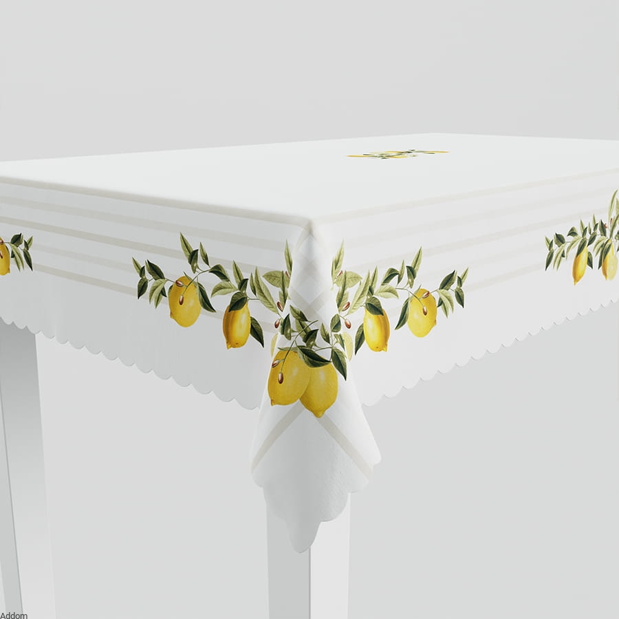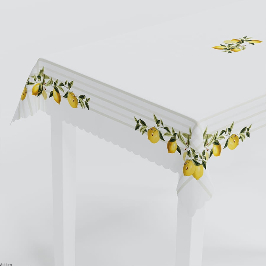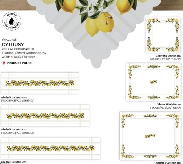 Obrus biały w cytrynki z ciemnozielonymi listkami, o ultrasonicznie formowanych brzegach z miłą dla oka falą na jego końcach. Obrus jest wodoodporny, więc płyny nie będą wnikać i brudzić go, a kolekcję w cytrynki można uzupełnić o tkaniny z motywem cytrusów, nakładki kwadratowe, czy firanki.