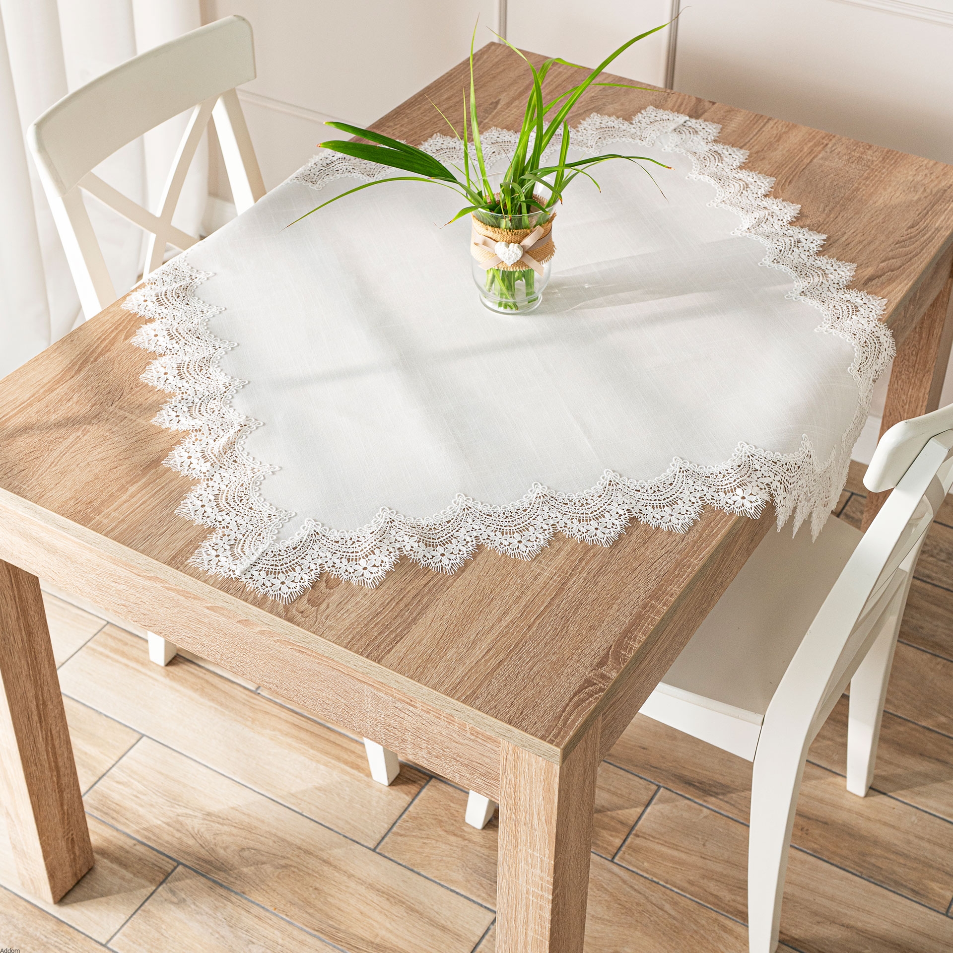Obrus gipiurowy, kwadratowy, obszywany naokoło szeroką, fantazyjną gipiurą, wykonany z materiału tkanego plamoodpornego w kolorze białym. Wymiary: 85x85 cm. Obrus jest bardzo elegancki, środek nie zawiera wszywanej gipiury ani żadnych ozdób, co może być przydatne w sytuacji, gdy mały stół wymaga bogatej zastawy.