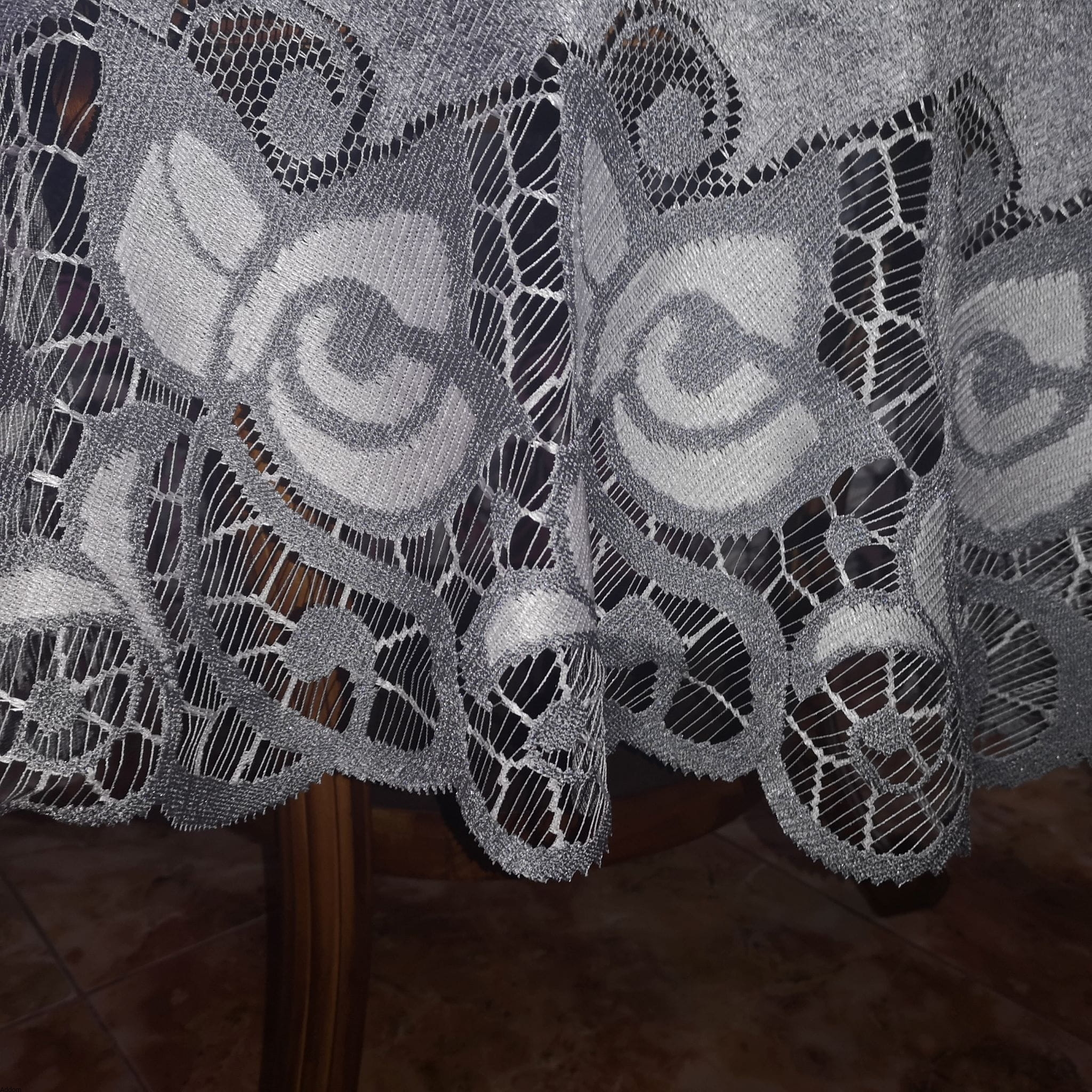 Obrus biały lub szaro-srebrny, owalny, żakardowy, o pokaźnych rozetach kwiatowych na części zwisającej ku podłodze, środek jednorodny, pełny. Motyw dekoracyjny jest bardzo powszechny na modnych obecnie tekstyliach i tapetach, z łatwością dobierzecie do niego Państwo odpowiednie akcesoria dekoracyjne, jak serwetki czy świeczki z tym motywem zdobniczym. Obrus jest gruby, produkcji polskiej, z Kalisza. Kształt owalny obrusu podkreśla owal blatu.