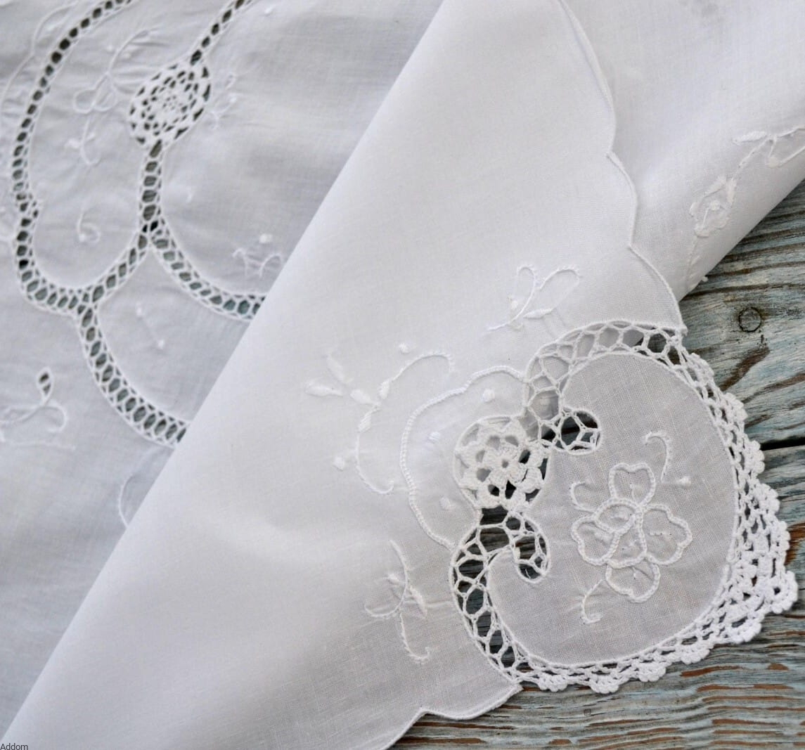 Dodatkowym atutem naszego obrusika jest koronka, która umieszczona jest na 4 rogach obrusiku. Ta subtelna ozdoba nadaje mu lekkości i romantycznego uroku. Koronka, podobnie jak haft, jest wykonana ręcznie, co podkreśla unikalny charakter produktu i jego wysoką jakość wykonania. Środek zdobiony jest haftem podobnym do mereżki, przez który widać będzie kolor stołu lub obrusa.