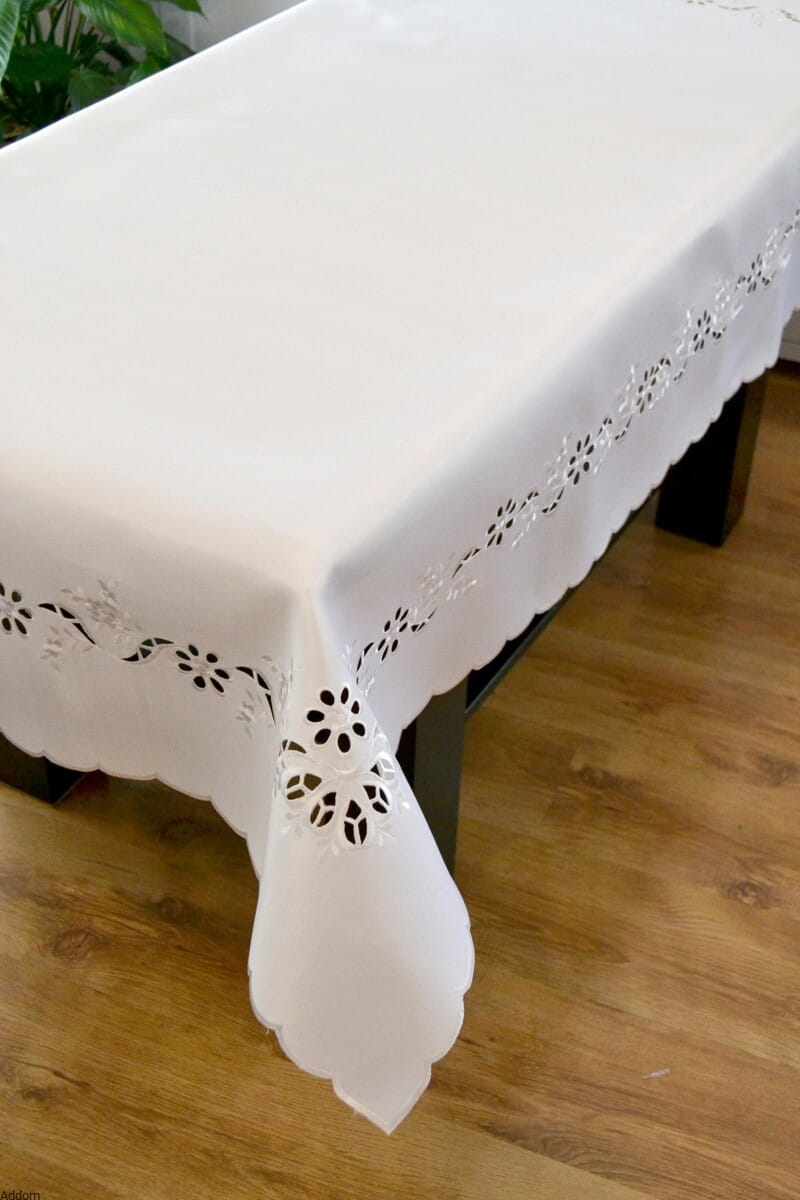 Obrusy w kolorze białym lub kremowym, które mają bogaty kwiatowy haft w formie stokrotek wycinanych z tkaniny. Obrusy są bardzo wyrafinowane, przepiękne, a dostępne w wielu rozmiarach. Dodatkowo z tego modelu można też dostać serwety i obrusy o kolistym kształcie.