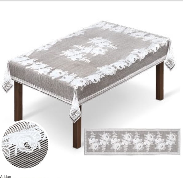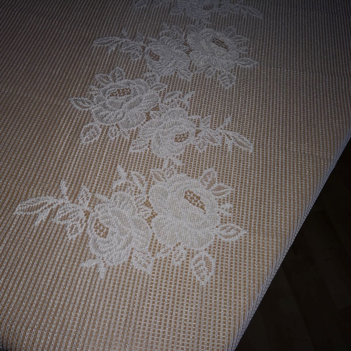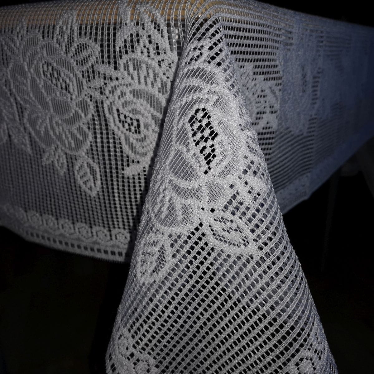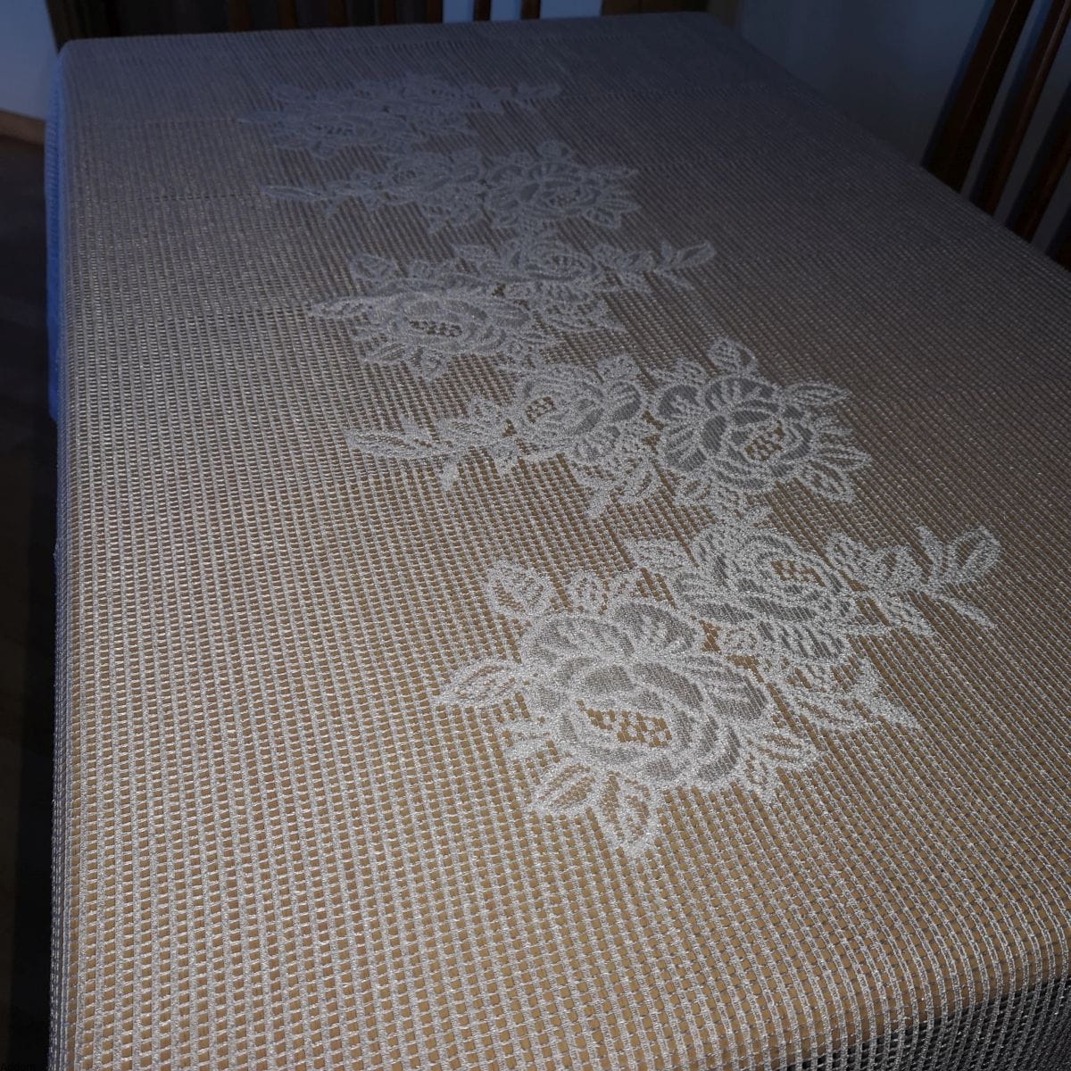 Białe obrusy typu żakard, w wiszące główkami w dół róże. Obrus ten to kombinacja elementów przejrzystej krateczki z nieprzejrzystymi wzorami i częścią użytkową obrusu. Model ten będzie odkrywał część blatu, dlatego wyjątkowo dekoracyjnie będzie wyglądał na ciemnym stole, kontrastując z nim. Ponadto do obrusu kupić można szale i krótsze bieżniki.