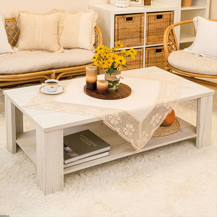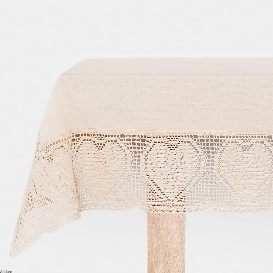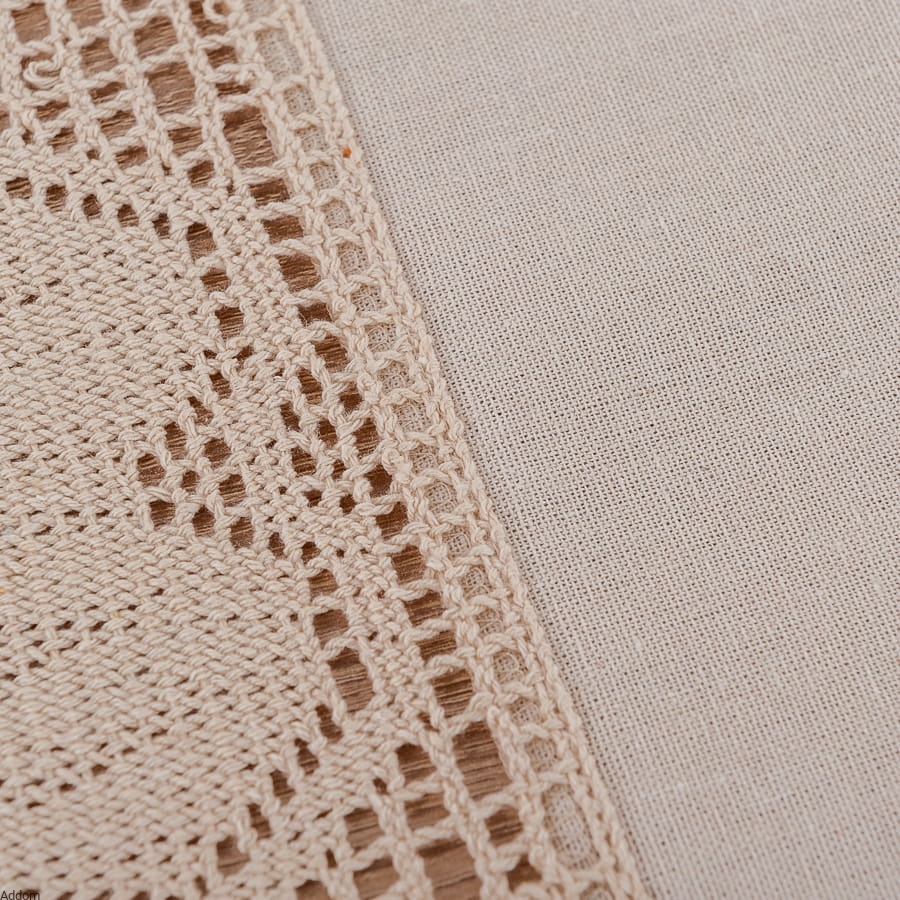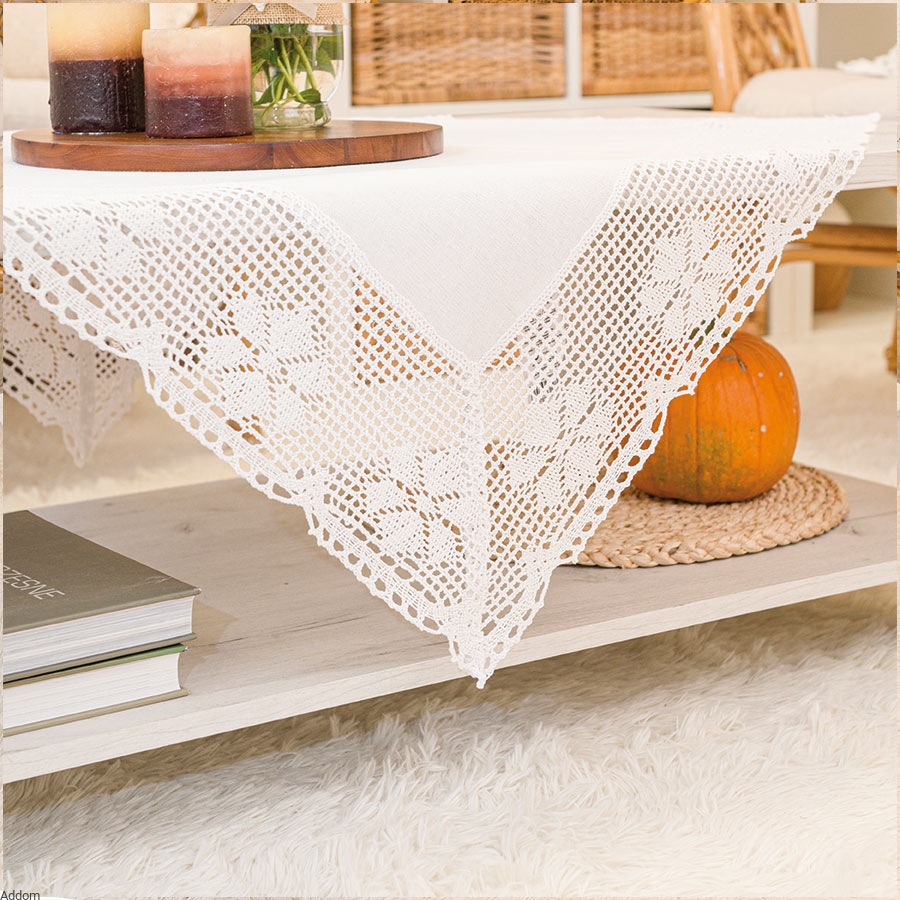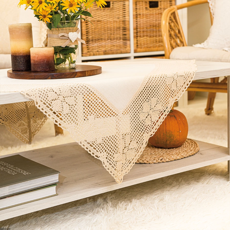 Ten kwadratowy obrus z bawełny charakteryzuje naturalność, zarówno przędzy tkaniny, jak i doszytej do niej koronki, wykonanej w technologii dzianiny szydełkowej. Obrusy te mają wymiary 85-85 i powstały z bawełnianego płótna obrusowego, o zwiększonej grubości, a wokoło doszyto szeroką koronkę w duże kwiaty, robioną na szydełku. Kolekcję dopełniają zazdrostki oraz powłoki dekoracyjne na poduszki, dostępne u nas do kompletu.