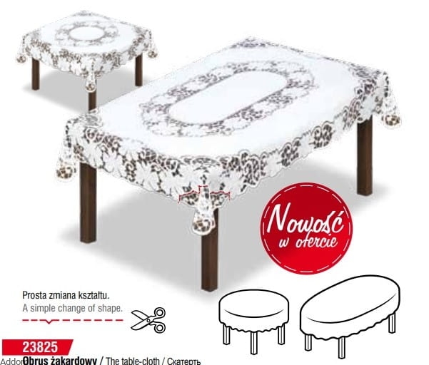 Obrusy żakardowe, którym można zmieniań kształt poprzez przycinanie, a sprzedawane są tutaj jako kwadratowe, którym można przyciąć samodzielnie rogi, kreując obrus owalny. Czasem nie wiemy, czy mamy stosować owalny czy prostokątny, gdyż blat wydaje się być prostokątem, jednak rogi są ścięte, lekko zaokrąglone, wówczas obrus ten przychodzi w pomocą niezdecydowanym. Zanim obetniecie, sprawdźcie, czy nie będzie wyglądał elegancko prostokąt na blacie o lekko zaokrąglonych rogach? Jest okazja to sprawdzić.