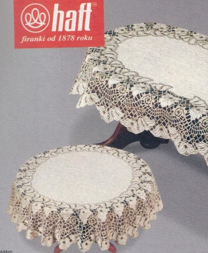Okrągłe obrusy żakardowe, o pełnym, grubym środku oraz grubym wzorze ażurowym, o znacznej szerokości, przez co bardzo dekoracyjnym. Wersja kolorystyczne to biel, złoty lub ecru, o ładnym, żółtawym odcieniu mocniejszego kremu. Jest to polski żakard produkcji kaliskiej fabryki firan i koronek.