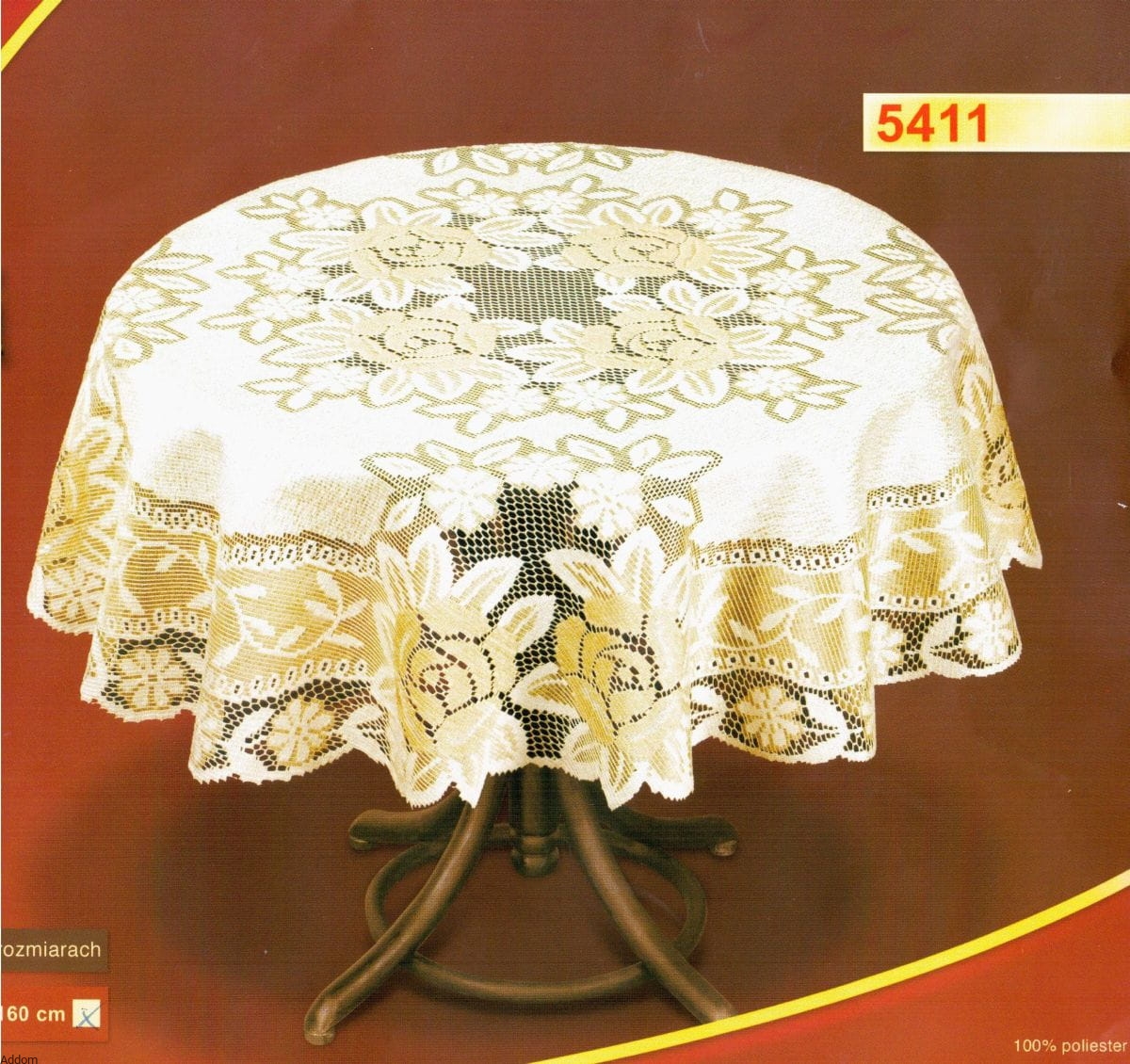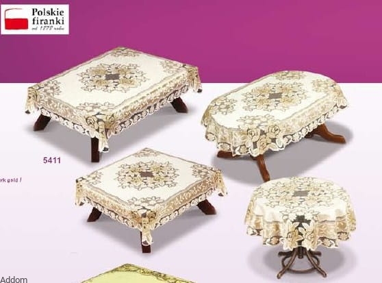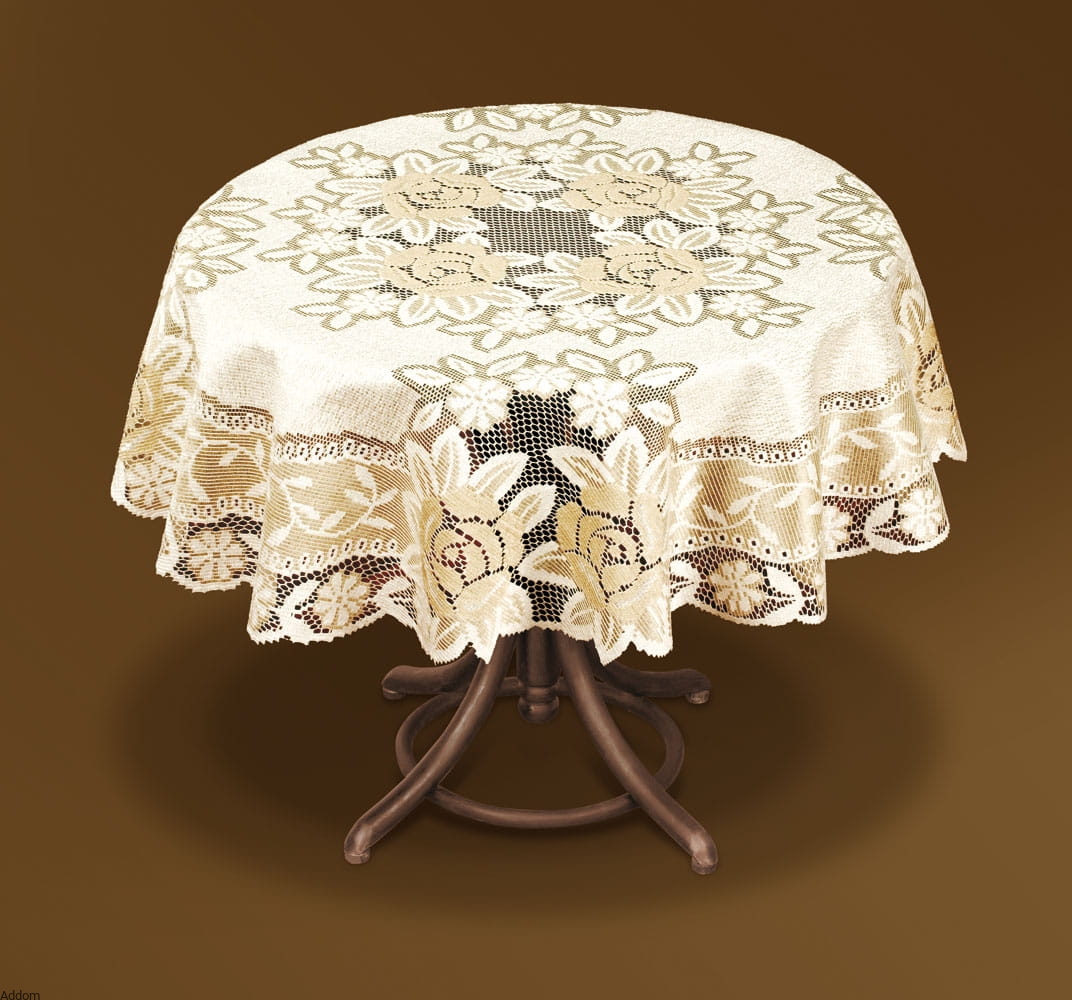 Okrągłe obrusy kremowe ze złotą przędzą, dostępne w 3 różnych średnicach koła, przepięknie zdobione różami otaczającymi ażurowy środek i brzegi dolne obrusu. Obrusy są dziane z nici złotej i kremowej, wzory kwiatów wykonano złotą nitką, a tło kwiatów jest ecru.