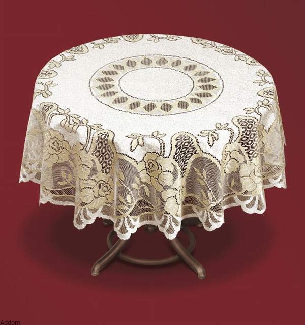 Obrusy z grubszej przędzy, żakardowe, o pełnym środku i półprzejrzystych brzegach, na dole dekorowane główkami zwisających od środka róż, o średnicy 90, 140 i 200 cm.