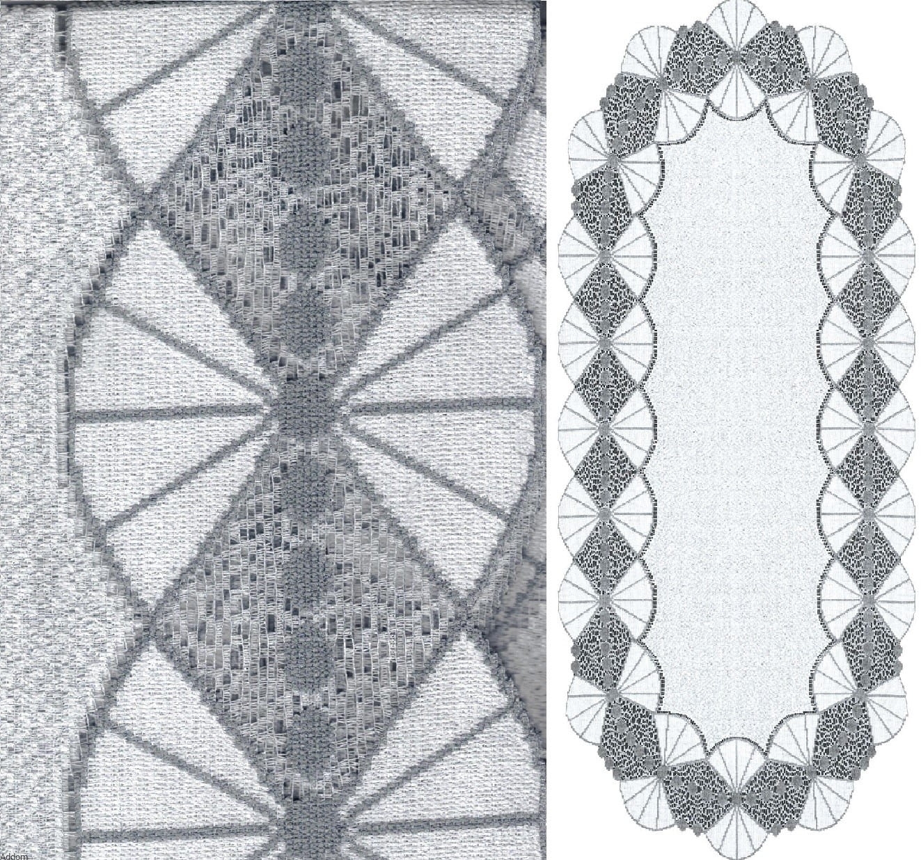 Owalny bieżnik z jasno srebrnej nici, z szarymi, matowymi wzorami inspirowanymi naturą, wykonany w technologii żakardu. Bieżnik najlepiej będzie prezentował się na białym lub jasnoszarym blacie, lub obrusie o takim samym kolorze, który będzie widoczny przez ażurowe elementy grafitowego wzoru, dobrze z nim kontrastując i uzupełniając tym kolorem bieżnik.