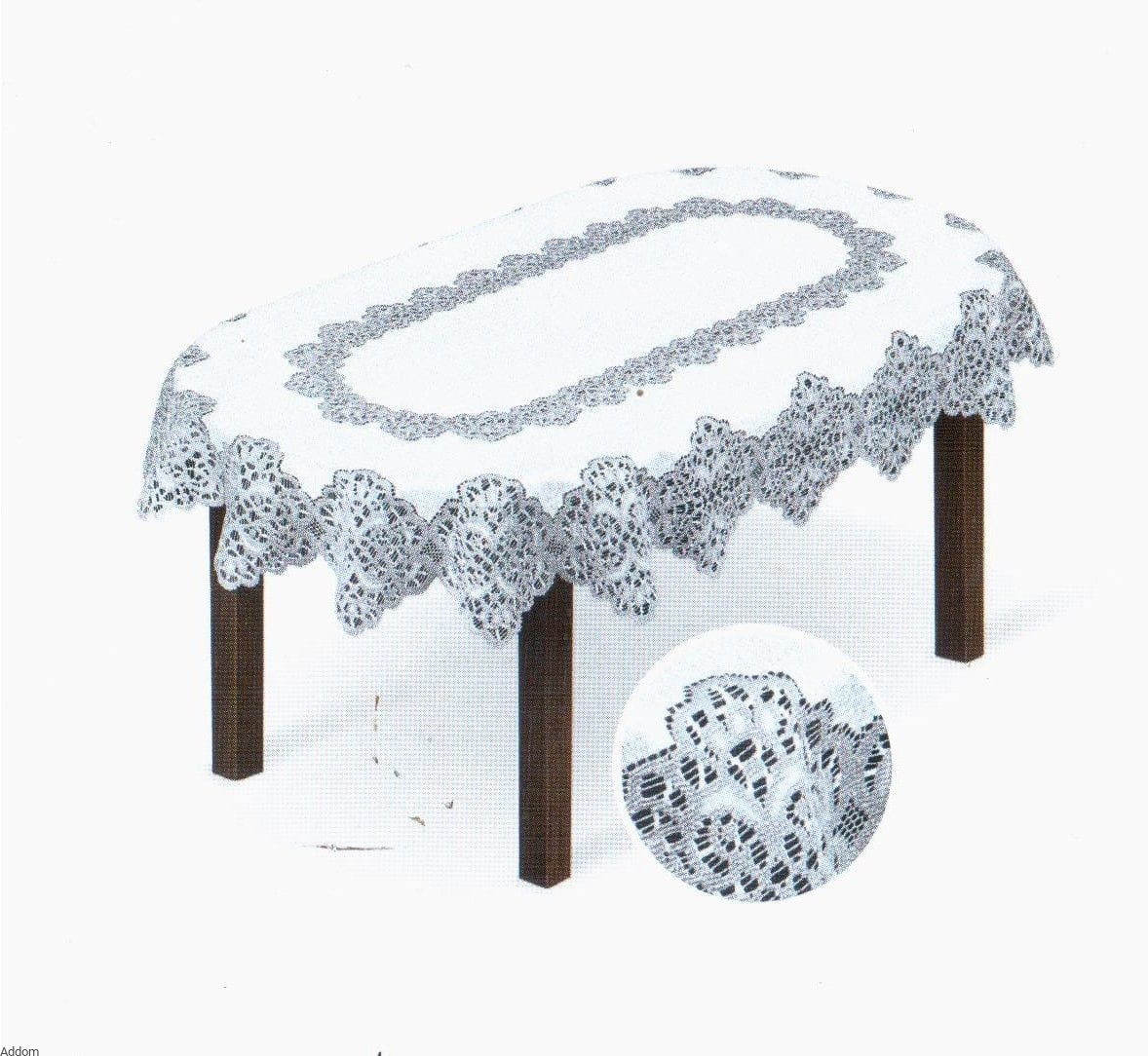Obrus owalny o srebrnym tle, wykonanym błyszczącą popielatą i białą nicią, z popielatymi, matowymi stylowymi wzorami, na obrzeżach oraz na środku blatu. Obrusy te powstały w kaliskiej fabryce w odpowiedzi na trendy, w których dominują odcienie popielatego i srebra. Obrus jest żakardowy, co oznacza, że należy do obrusów praktycznych, niewymagających, łatwo spieralnych, a ich wygląd wpasowujący się w trendy modowe sprawia, że obrusy żakardowe zyskują nowe życie. Dotychczas kojarzone ze starszym pokoleniem użytkowników, obecnie tak dopracowane, że potrafią być krok do przodu przed obrusami tkaninowymi.