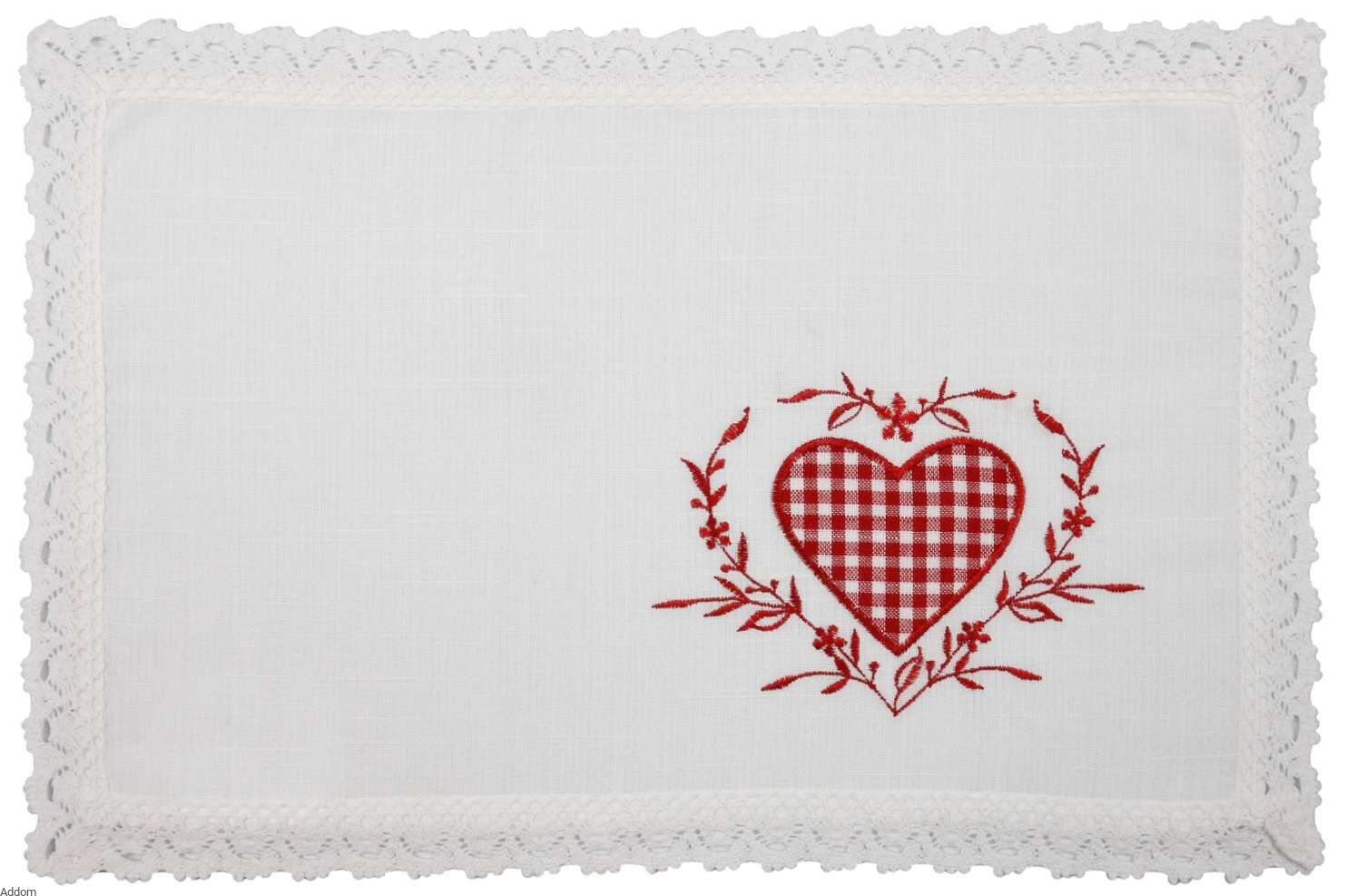 Podkładki obiadowe 30x45 mają wyhaftowane jedno serduszko, dłuższe bieżniki mają 2 serduszka na obu końcach bieżników.