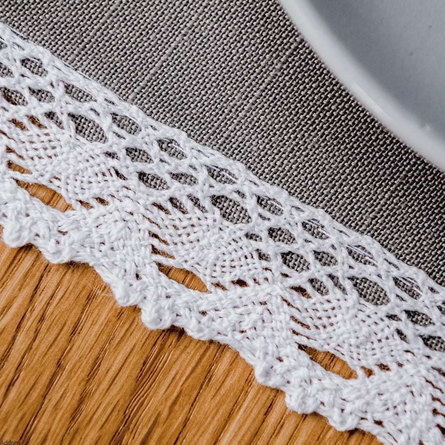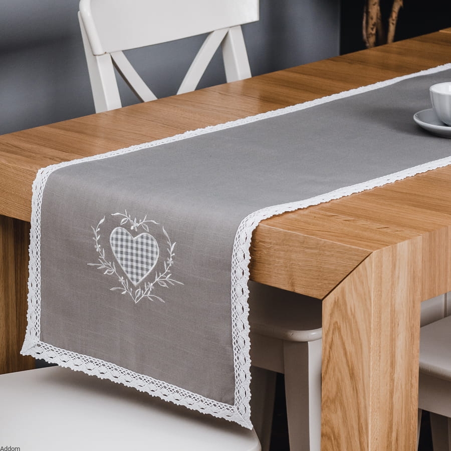 Bieżnik z ciemnej, ciemno szarej tkaniny lub białej w kolorze biel naturalna, obszyty naokoło bawełnianą koronką, a na obu końcach bieżnika znajdują się haftowane serca. Haft wykonany został jasną, beżową nicią lub czerwoną, w wersji białej, obszyciem jest bawełniana koronka. Tkanina użyta do uszycia bieżnika jest plamoodporna, o wyglądzie tkaniny bawełnianej, natomiast haft i koronka nie są pokryte teflonem czyli mogą ulegać zaplamieniom, w przypadku rozlania mocno barwiących napojów należy koronkę i haft poddać działaniu zimnej, bieżącej wody.