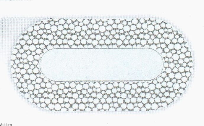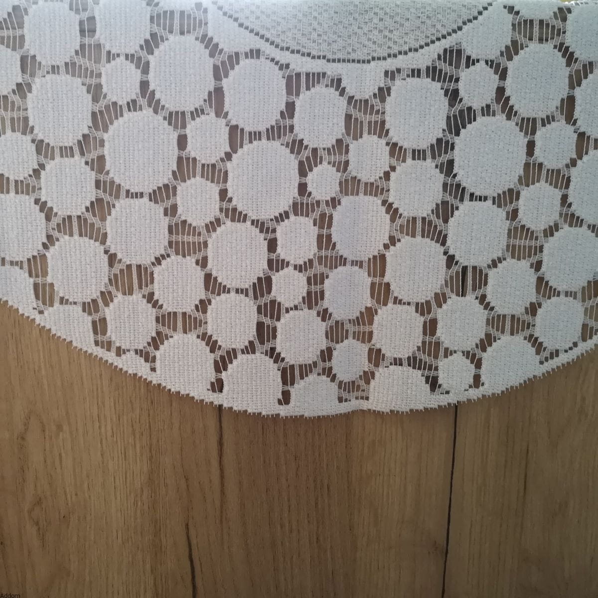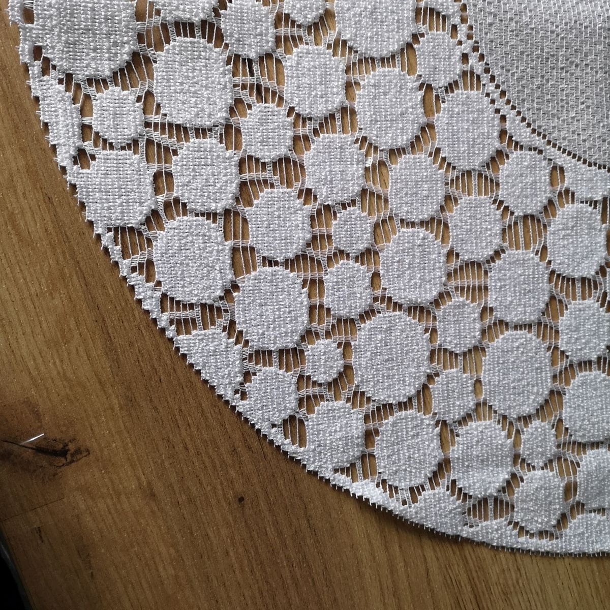 Bieżnik owalny w mniejsze i większe kółeczka otaczające jajowaty, pełny środek, dość gruby i dobrze leżący na blacie. Bieżnik produkowany jest w 2 popularnych rozmiarach, 50x100 oraz 60x120 cm i należy do szerokiej gamy dekoracji wnętrz w kółeczka, do której należą jeszcze firany i obrusy.